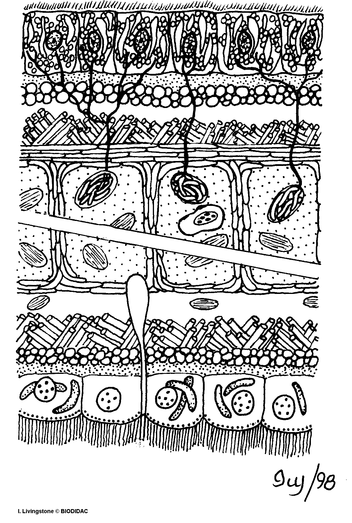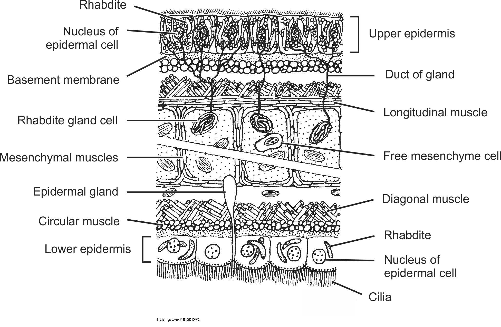 Labels (EN) : Rhabdite, Nucleus of epidermal cell, Basement membrane, Longitudinal muscle, Rhabdite gland cell, Mesenchymal muscles, Epidermal gland, Lower epidermis, Circular muscle, Upper epidermis, Duct of gland, Free mesenchyme cell, Diagonal muscle, Nucleus of epidermal cell, Rhabdite, Cilia