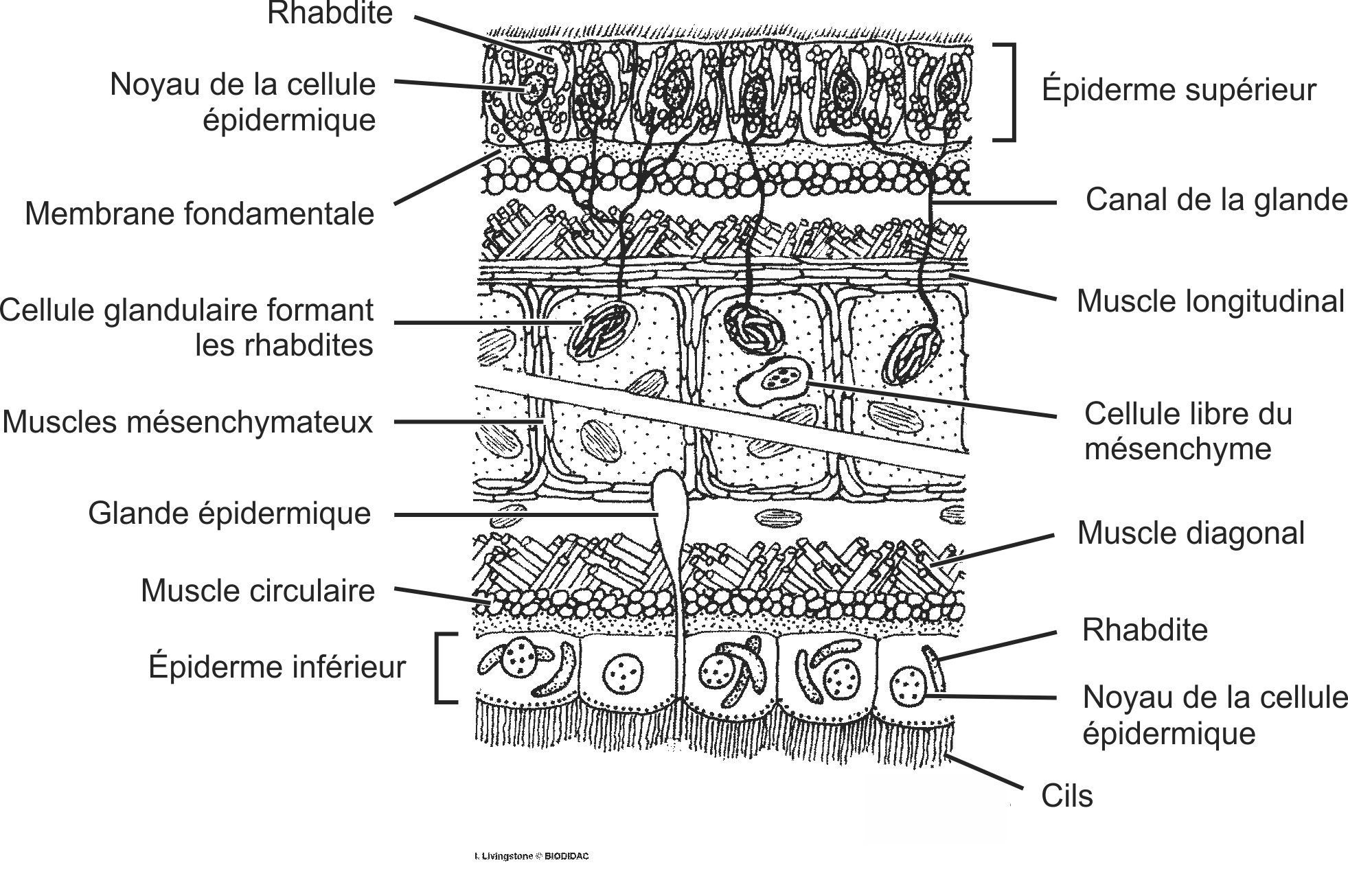 Étiquettes (FR) : Rhabdite, Noyau de la cellule épidermique, Membrane fondamentale, Muscle longitudinal, Cellule glandulaire formant les rhabdites, Muscles mésenchymateux, Glande épidermique, Épiderme inférieur, Muscle circulaire, Épiderme supérieur, Canal de la glande, Cellule libre du mésenchyme, Muscle diagonal, Noyau de la cellule épidermique, Rhabdite, Cils