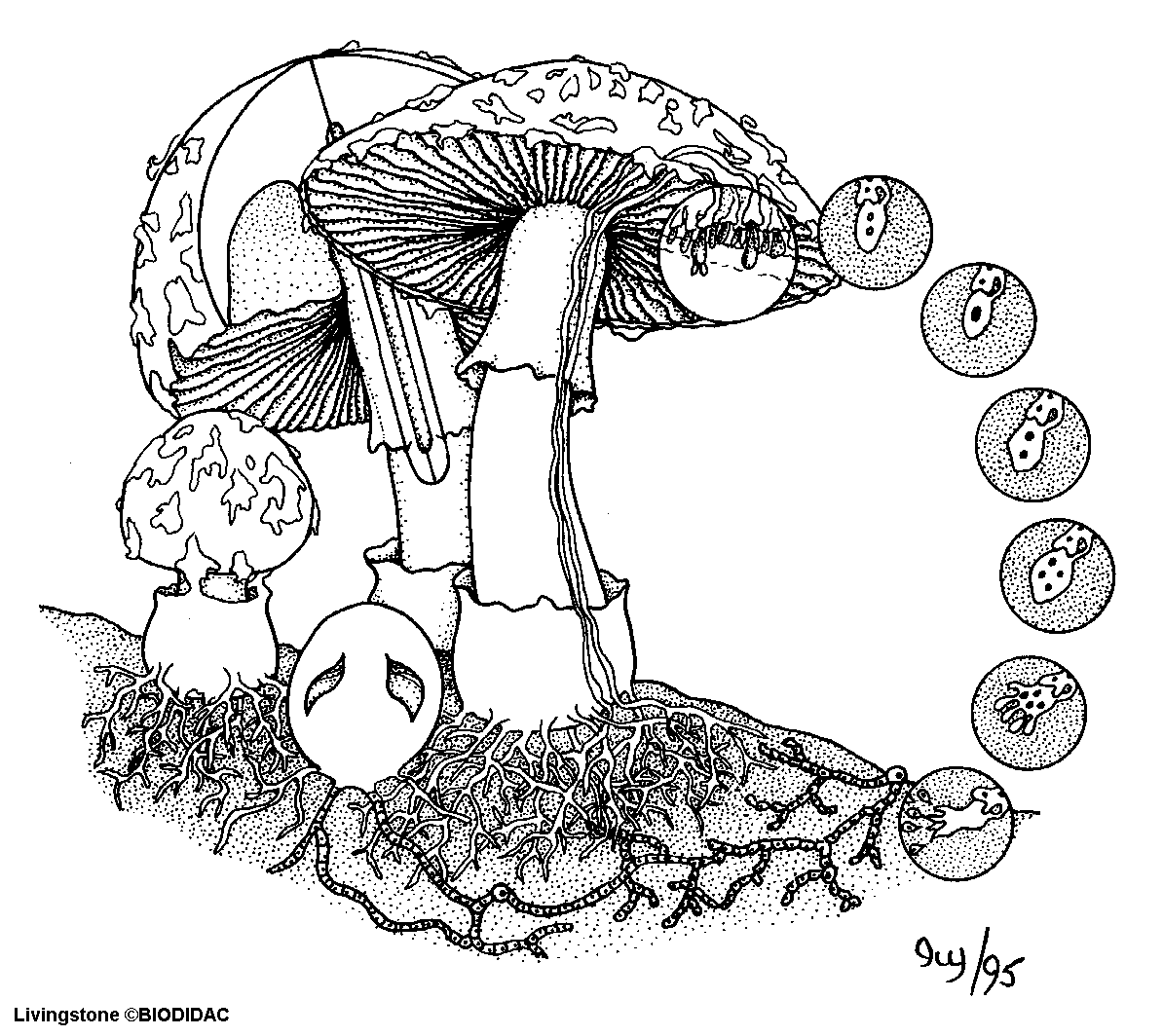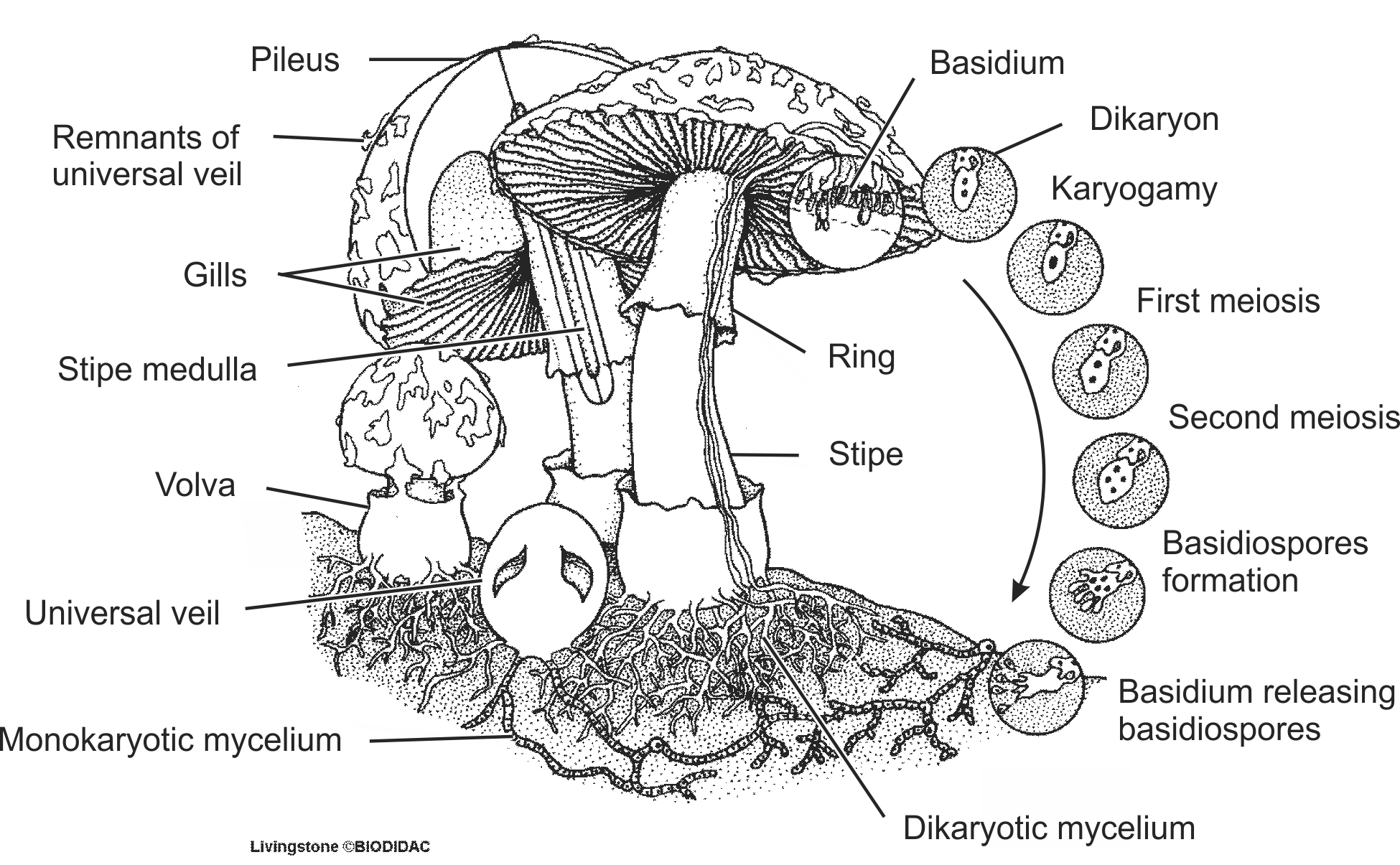 Labels (EN) : Stipe medulla, Gills, Pileus, Remnants of universal veil, Volva, Universal veil, Monokaryotic mycelium, Dikaryon, Karyogamy, First meiosis, Second meiosis, Basidiospores formation, Basidium releasing basidiospores, Dikaryotic mycelium, Stipe, Ring, Basidium