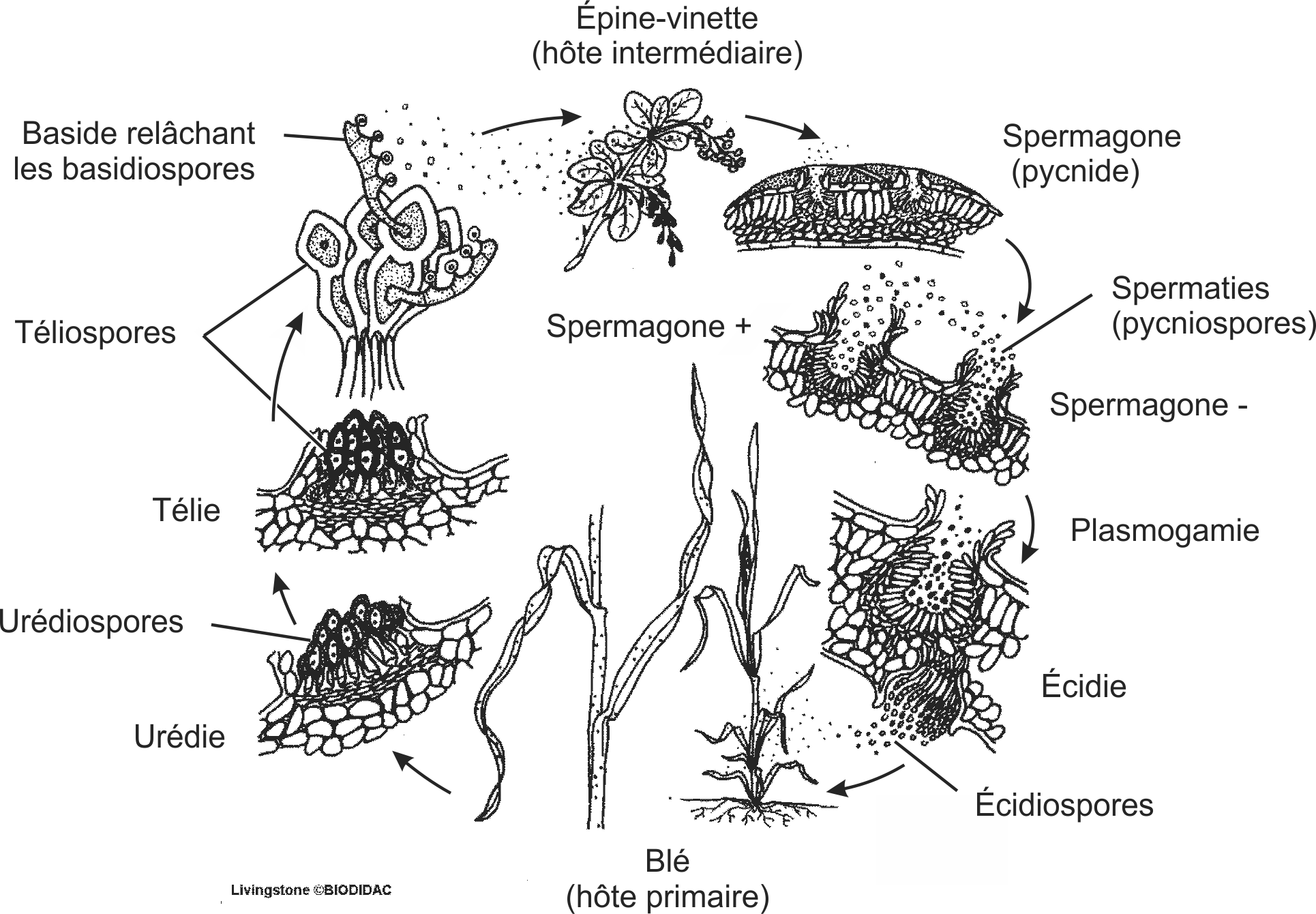 (EN) : Life cycle: It is complex, involving five spore stages (urediniospores, teliospores, basidiospores, pycniospores, and aeciospores) and two hosts (wheat and barberry). No labels (image 1) + English labels (image 2) + French labels (image 3).