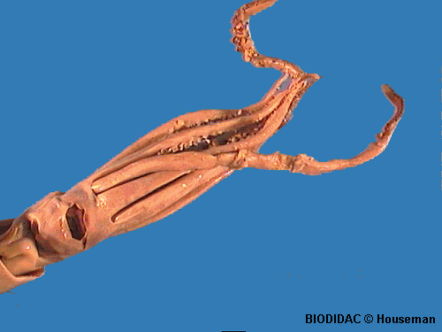 (EN) : External anatomy: Close-up view of the anterior side of the animal showing the eight arms and two tentacles.