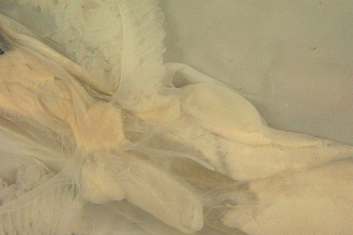 (FR) : Anatomie interne : Vue rapprochée de l'intérieur du manteau près du milieu montrant une partie des deux cténidies et une partie du système circulatoire, y compris les deux cœurs branchiaux et le cœur systémique.