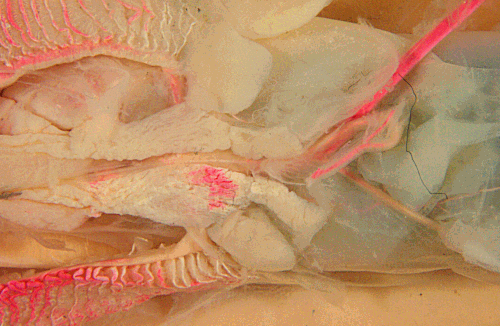 (EN) : Internal anatomy: Close-up view inside the mantle near the middle showing part of the two ctenidia and part of the circulatory system, including the two branchial hearts, systemic heart, left/right mantle arteries, and anterior aorta.