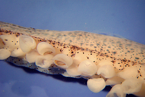 (EN) : External anatomy: Close-up view of the two rows of suckers on one part of an arm or tentacle, each sucker connected to the arm/tentacle by a peduncle and its hollow, muscular central part is surrounded by a chitinous ring of teeth, which are used as a defense against predators.