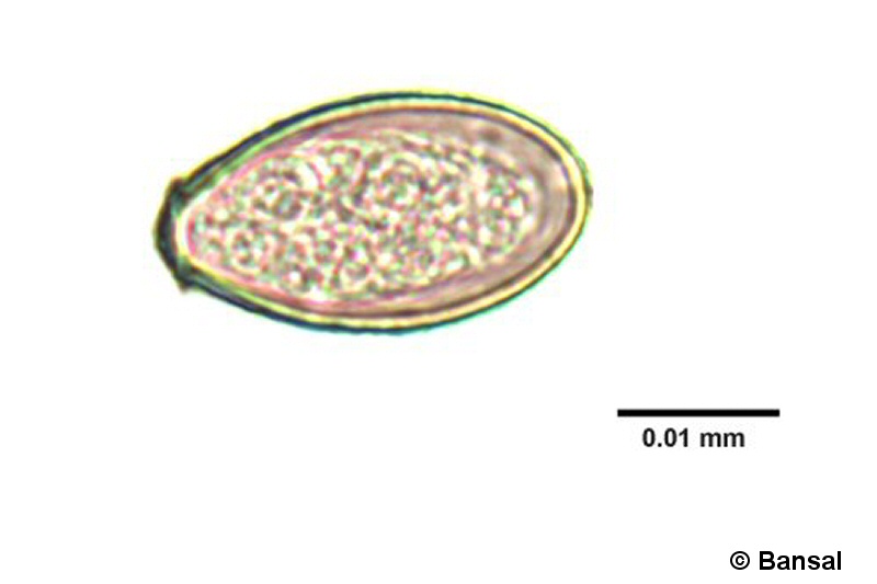(FR) : Œuf : Caractéristiques générales, notamment la petite ouverture en forme de couvercle, appelée opercule, à une extrémité. Il s'agit peut-être d'un œuf du genre Diphyllobothrium.