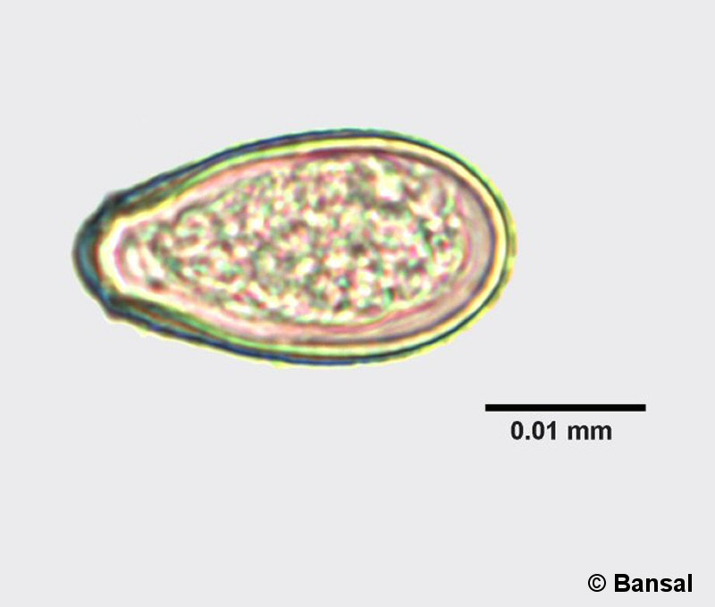 (FR) : Œuf : Caractéristiques générales, notamment la petite ouverture en forme de couvercle, appelée opercule, à une extrémité. Il s'agit peut-être d'un œuf du genre Diphyllobothrium.