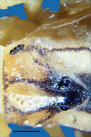 (FR) : Spécimen adulte : Vue rapprochée de la surface externe dorsale du prosome (région antérieure) montrant les yeux simples, une paire d'yeux médians situés sur la ligne médiane de la carapace et trois paires d'yeux latéraux situés le long des côtés de la carapace.