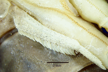 (EN) : Adult specimen: Close-up view of the ventral external surface of the mesosoma (anterior region of opisthosoma) showing one of the pair of comb-like sensory organs, called pectines, on the second segment, which have a series of teeth and a network of nerves extending into each tooth to detect both chemical and mechanical stimuli.