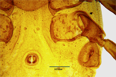 (FR) : Spécimen : Vue rapprochée de l'idiosome montrant l'un des stigmates et la plaque anale avec l'anus.