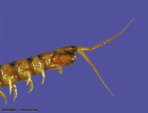 (FR) : Anatomie externe : Vue rapprochée de la face latérale montrant le tronc avec les deux forcipules sur le premier segment et une paire de pattes sur les autres segments, ainsi que la tête avec ses deux antennes et ses ocelles.