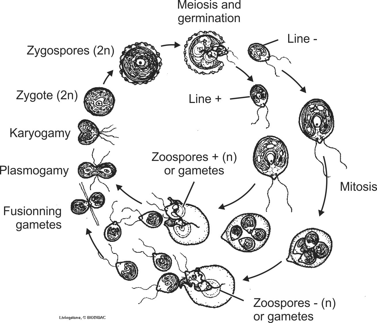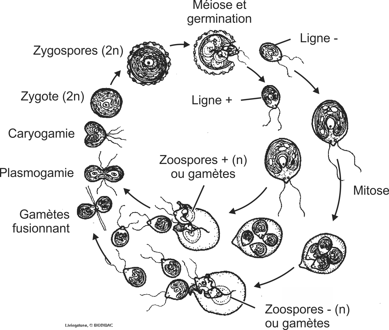 Étiquettes (FR) : Méiose et germination, Zygospores (2n), Zygote (2n), Caryogamie, Plasmogamie, Gamètes fusionnant, Ligne +, Ligne -, Zoospores - (n) ou gamètes, Zoospores + (n) ou gamètes, Mitose