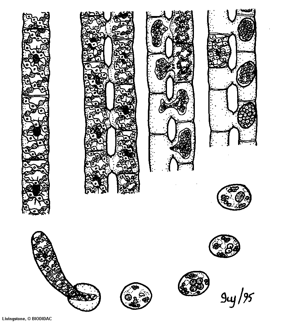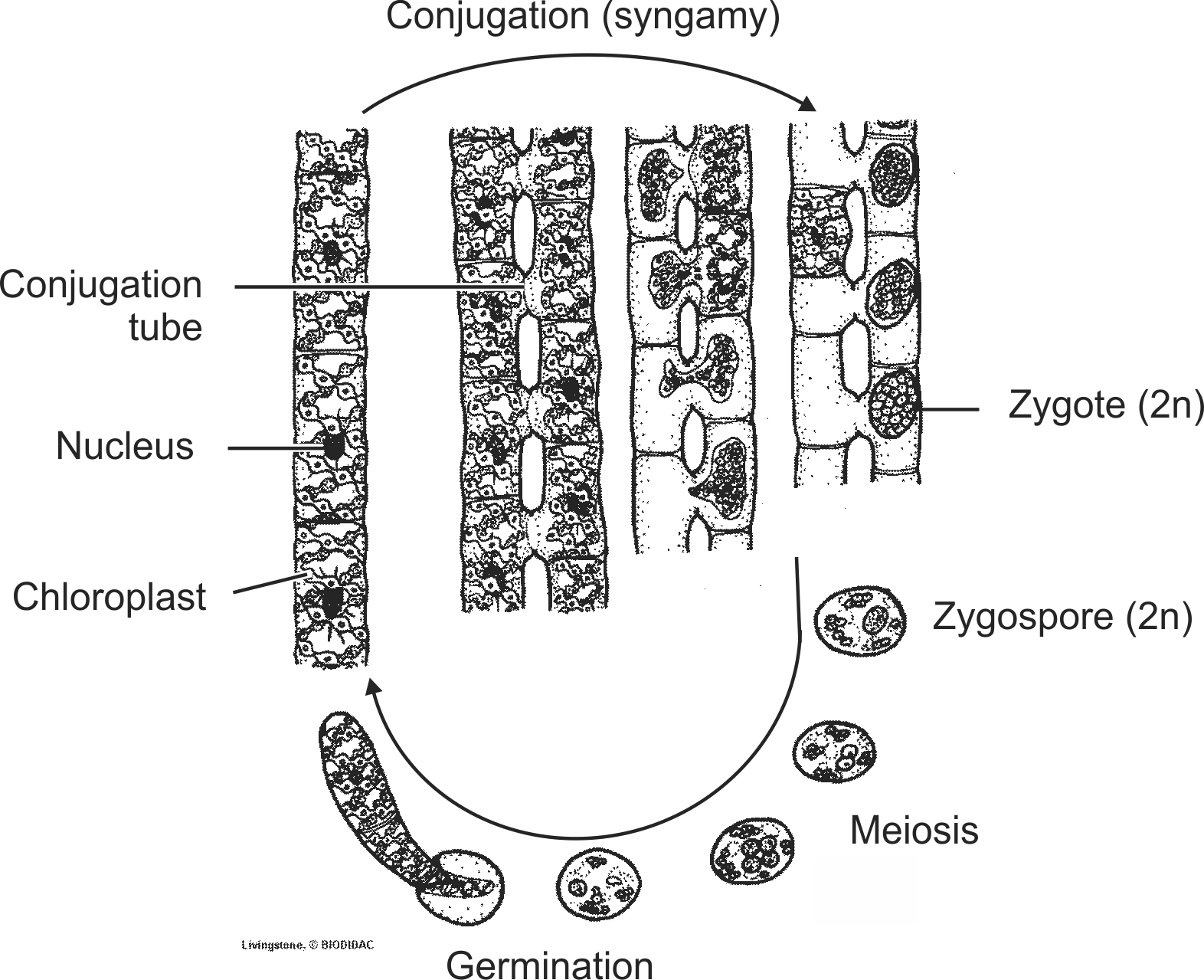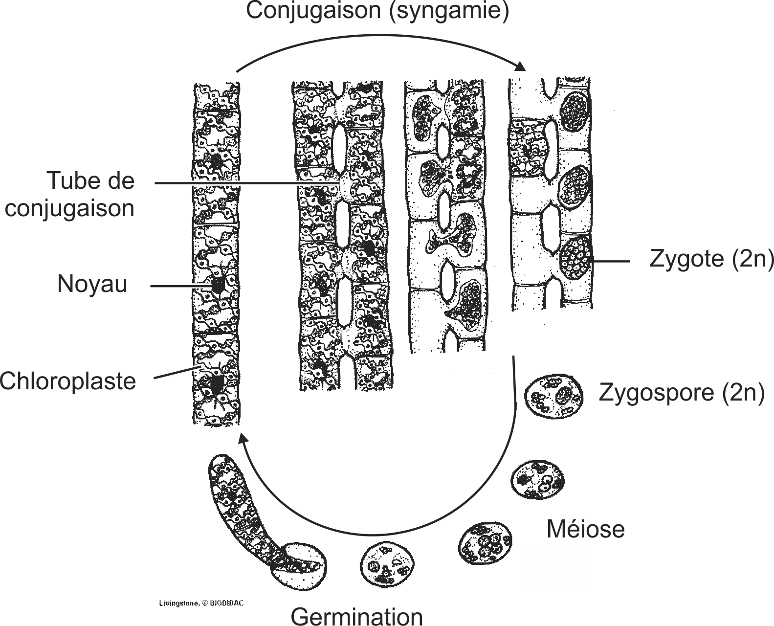 Étiquettes (FR) : Conjugaison (syngamie), Chloroplaste, Noyau, Tube de conjugaison, Germination, Méiose, Zygospore (2n), Zygote (2n)