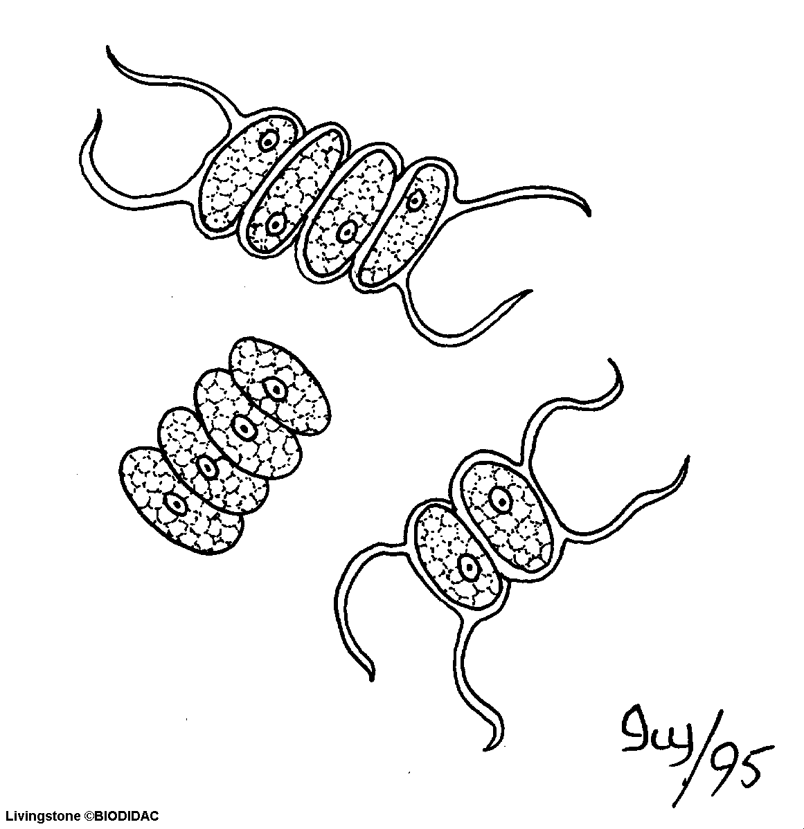 (EN) : Colonies (also known as coenobia): They typically consist of 2, 4, 8, 16, or 32 cells (often in multiple of 2) arranged in a linear or flat plate formation and joined together by a mucilaginous matrix. The cells can be cylindrical, lunate (crescent-shaped), ovoid, or fusiform and, depending on the species, some may have spines or other appendages on their cell walls, particularly cells at the ends of the colony.