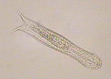 (FR) : Spécimen : Caractéristiques anatomiques générales du corps entier, y compris la bouche à l'extrémité antérieure et la structure fourchue, furca ou fourche caudale, à l'extrémité postérieure.