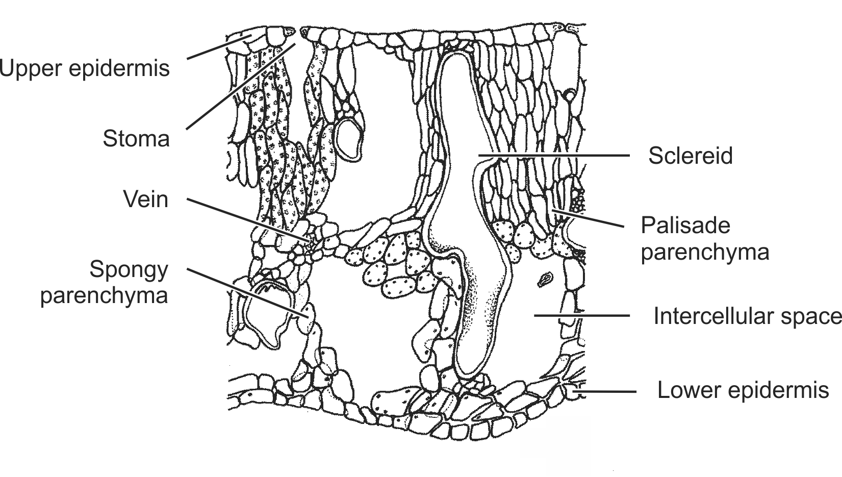 Labels (EN) : Lower epidermis, Intercellular space, Vein, Stoma, Spongy parenchyma, Palisade parenchyma, Sclereid, Upper epidermis