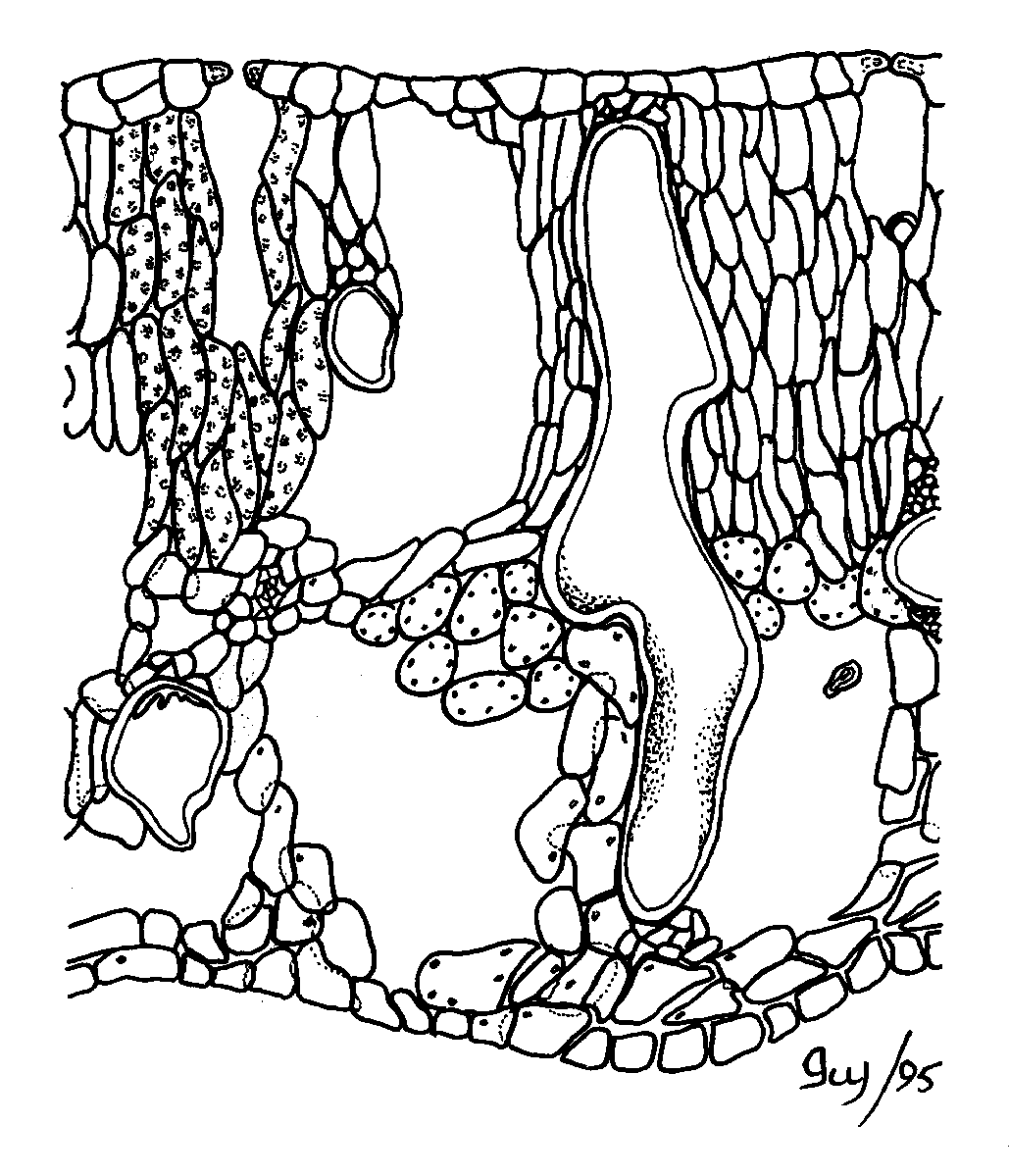 Étiquettes (FR) : Épiderme inférieur , Espace intercellulaire, Nervure, Stomate, Parenchyme spongieux, Parenchyme palissadique, Sclérite, Épiderme supérieur