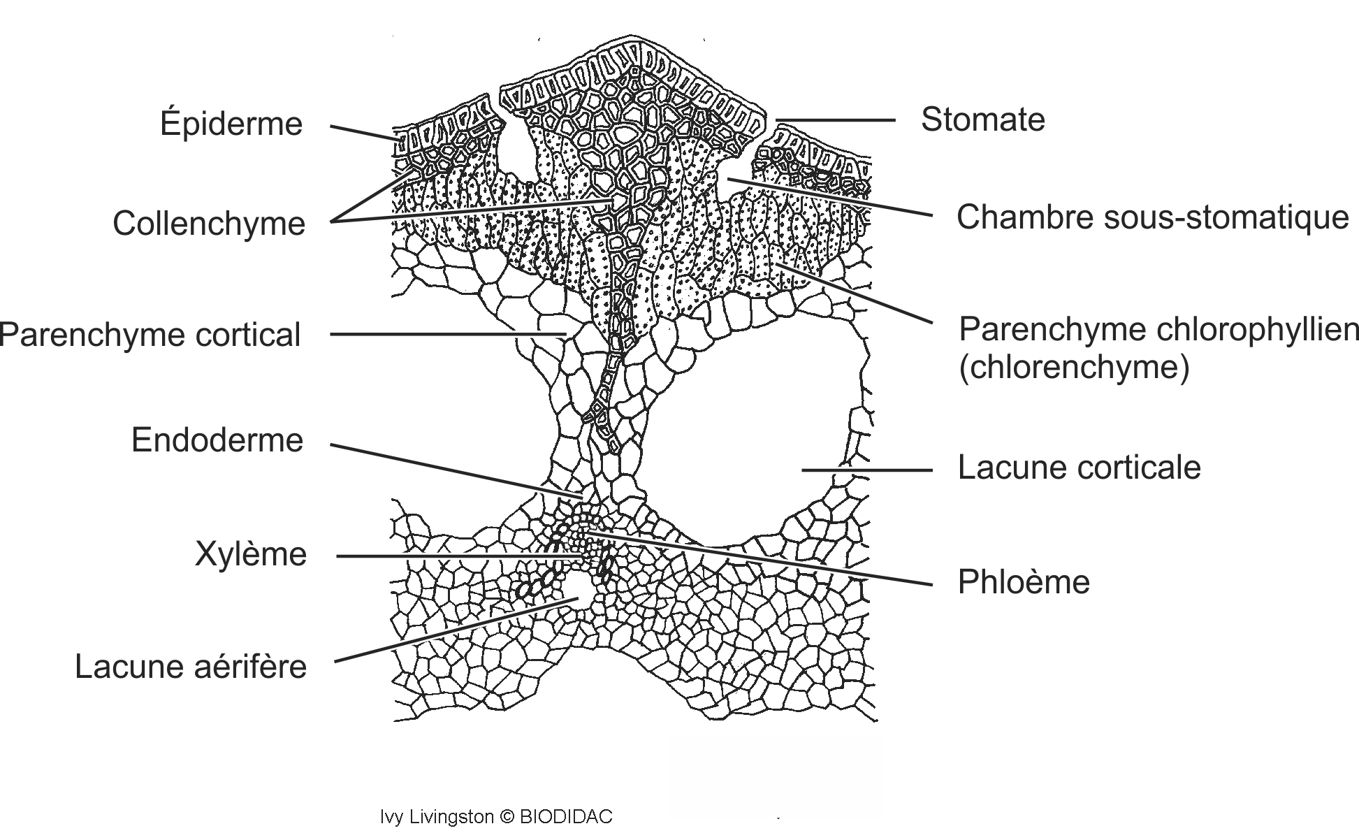 Étiquettes (FR) : Stomate, Chambre sous-stomatique, Parenchyme chlorophyllien (chlorenchyme), Phloème, Lacune corticale, Collenchyme, Épiderme, Parenchyme cortical, Endoderme, Xylème, Lacune aérifère
