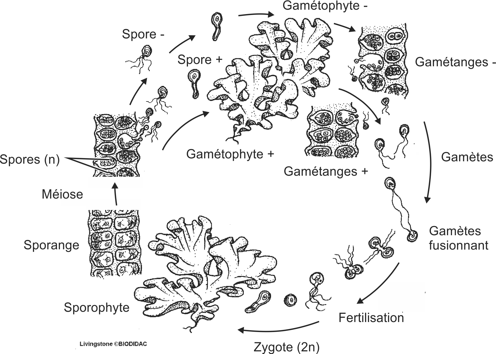 Étiquettes (FR) : Méiose, Spores (n), Sporange, Sporophyte, Zygote (2n), Fertilisation, Gamètes fusionnant, Gamètes, Gamétanges +, Gamétanges -, Gamétophyte +, Gamétophyte -, Spore -, Spore +