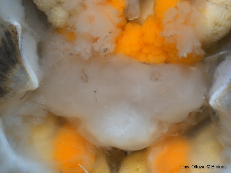 (EN) : Internal anatomy: Close-up view showing the heart, which consists of a single, muscular ventricle suspended within the pericardial sinus, and its openings called ostia.
