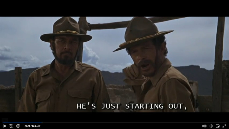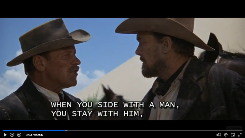 En esta captura de pantalla, podemos ver a Bishop discutiendo con uno de los hermanos Gorch. El hermano, que creo que es Lyle, quería matar a Freddie Sykes porque les estaba retrasando y causando problemas. Bishop se negó y dijo: «Vamos a seguir juntos, como antes. Cuando te pones del lado de un hombre, te quedas con él, y si no puedes hacerlo, eres como un animal» (The Wild Bunch 00:37:51, traducción nuestra).