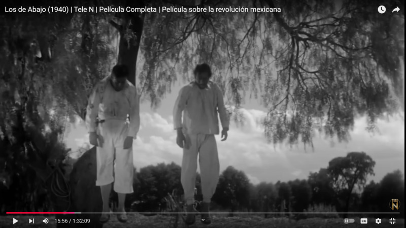En esta captura de pantalla, se observan dos revolucionarios ejecutados por los federales (Los de Abajo 00:15:56). Son colgados de un árbol como un símbolo de castigo público y control. Esta representación visual destaca la brutalidad sistemática utilizada por las fuerzas federales para imponer su autoridad y sembrar el miedo en la población rural durante la Revolución Mexicana. La violencia aquí es presentada como un acto político, calculado y deshumanizador, que refuerza el poder de los opresores.