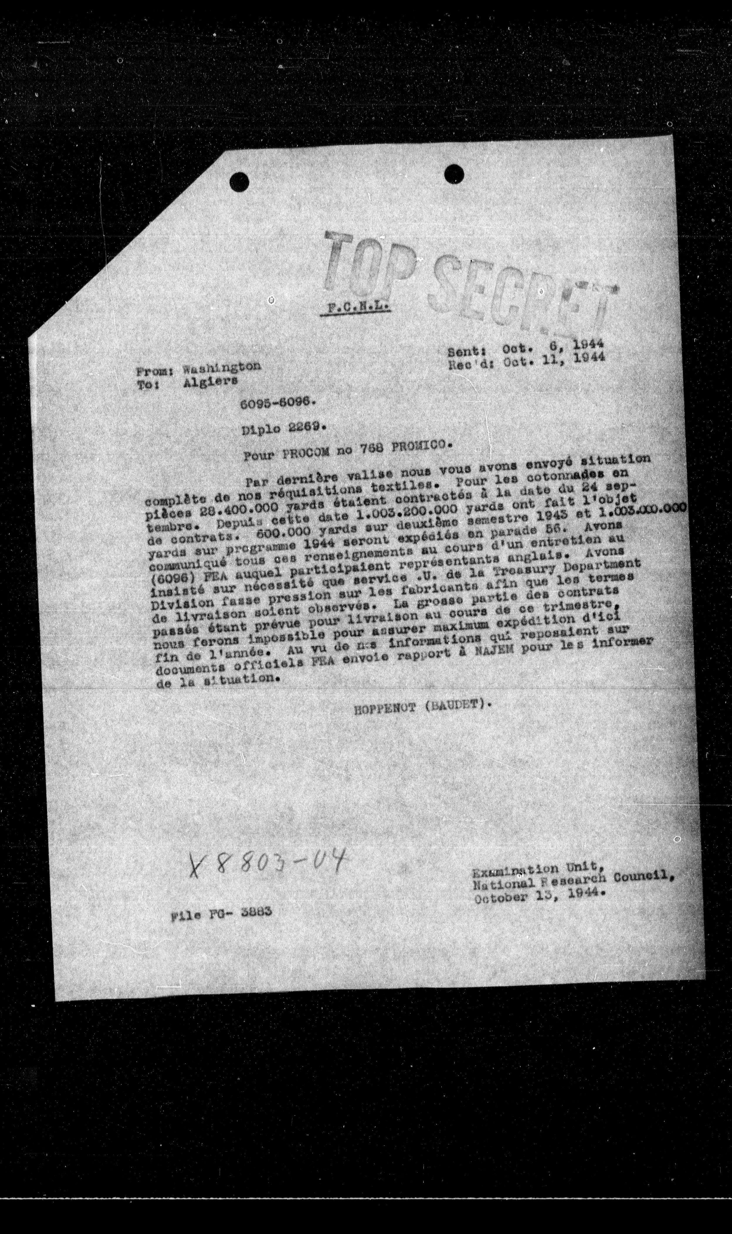 Par dernière valise nous vous avons envoyé situation complète de nos réquisitions textiles. Pour les cotonnades en pièces 28.400.000 yards étaient contractés à la date du 24 septembre. Depuis cette date 1.003.200.000 yards ont fait l'objet de contrats. 600.000 yards sur deuxième semestre 1943 et 1.003.000.000 yards sur programme 1944 seront expédiés en parade 58. Avons communiqué tous ces renseignements au cours d'un entretien au (6096) PEA auquel participaient représentants anglais. Avons insisté sur nécessité que service U. de la Treasury Department Division fasse pression sur les fabricants afin que les termes de livraison soient observés. La grosse partie des contrats passés étant prévue pour livraison au cours de ce trimestre, nous ferons impossible pour assurer maximum expédition d'ici fin de l'année. Au vu de nos informations qui reposaient sur documents officiels PEA envoie rapport à NAJEM pour les informer de la situation.