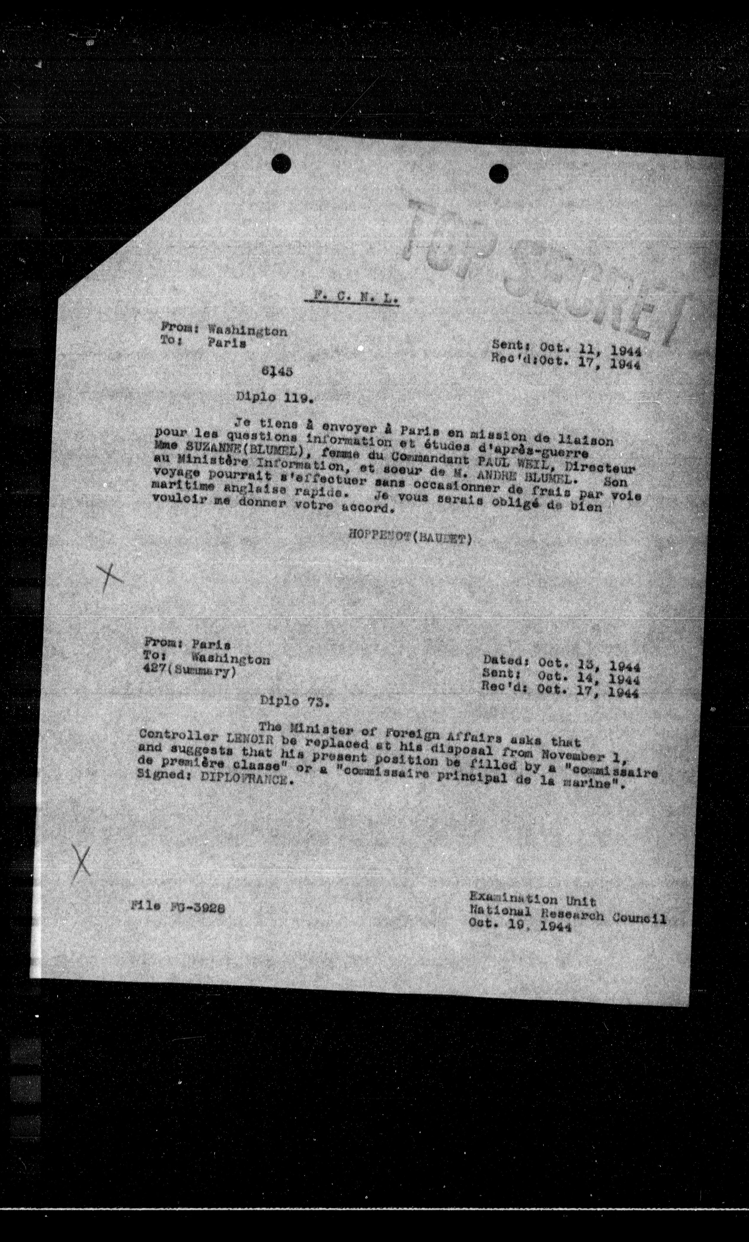 Je tiens à envoyer à Paris en mission de liaison pour les questions information et études d'après-guerre des SURANDE (BLUMEL), femme du Commandant PAUL MEIL, Directeur au Ministère Information, et coeur de M. ANDRE BLUMEL. Son voyage pourrait s'effectuer sans occasionner de frais par voie maritime anglaise rapide. Je vous serais obligé de bien vouloir me donner votre accord.