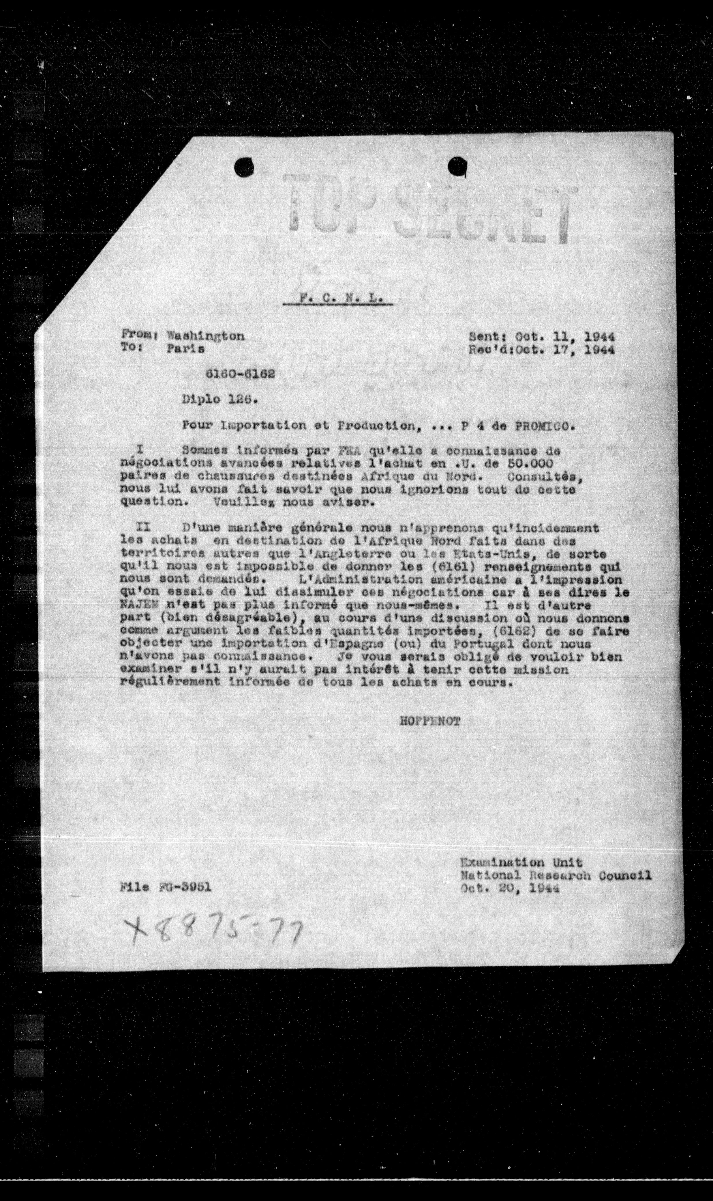 II D'une manière générale nous n'apprenons qu'incidement les achats en destination de l'Afrique Nord faits dans des territoires autres que l'Angleterre ou les Etats-Unis, de sorte qu'il nous est impossible de donner les (6161) renseignements qui nous sont demandés. L'Administration américaine a l'impression qu'on essaie de lui dissimuler ces négociations car à ses dires le NAJEE n'est pas plus informé que nous-mêmes. Il est d'autre part (bien désagréable), au cours d'une discussion où nous donnons comme argument les faibles quantités importées, (6162) de se faire objecter une importation d'Espagne (ou) du Portugal dont nous n'avons pas connaissance. Je vous serais obligé de vouloir bien examiner s'il n'y aurait pas intérêt à tenir cette mission régulièrement informée de tous les achats en cours.