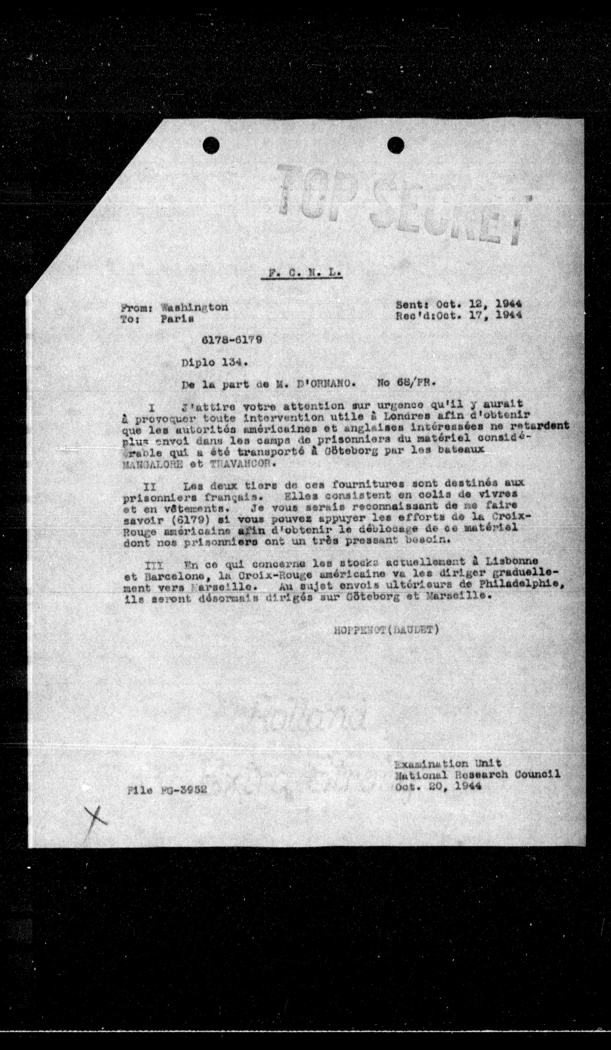 II Les deux tiers de ces fournitures sont destinés aux prisonniers français. Elles consistent en colis de vivres et en vêtements. Je vous serais reconnaissant de me faire savoir (6179) si vous pouvez appuyer les efforts de la CroixRouge américaine afin d'obtenir le déblocage de ce matériel dont nos prisonniers ont un très pressant besoin.