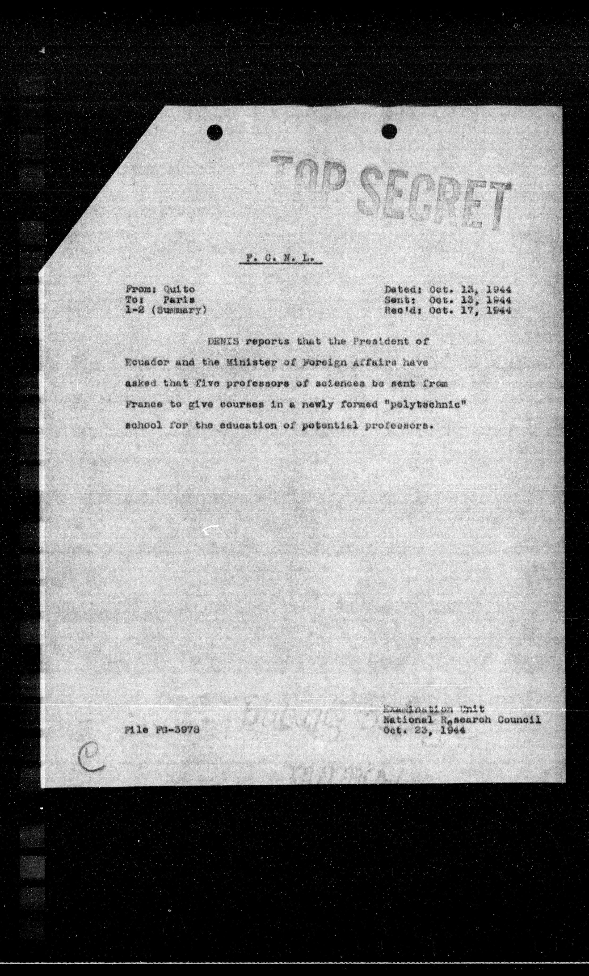 DENIS reports that the President of Ecuador and the Minister of Foreign Affairs have asked that five professors of sciences be sent from France to give courses in a newly formed "polytechnic" school for the education of potential professors.