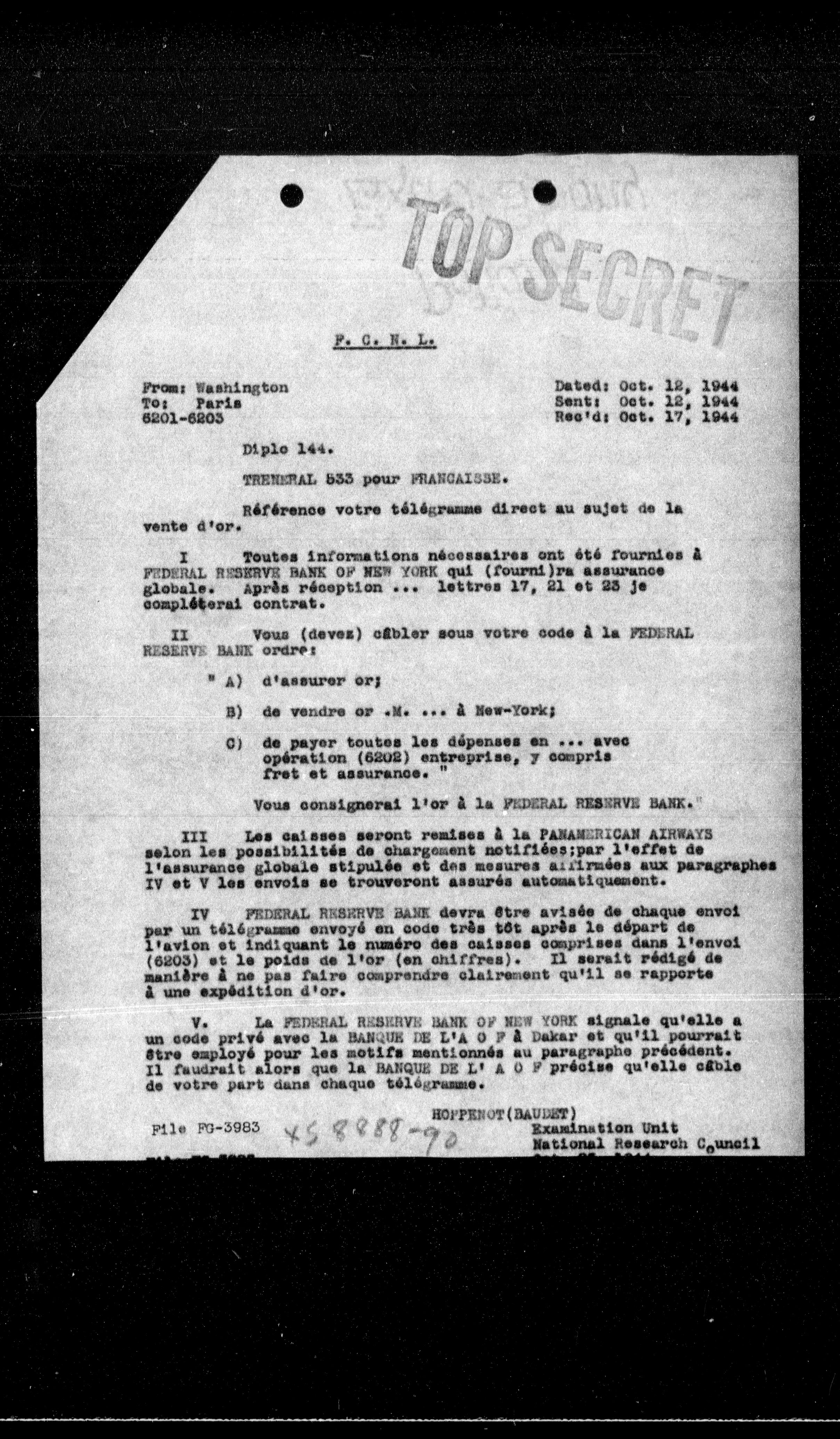 IV FEDERAL RESERVE BANK devra être avisée de chaque envoi par un télégramme envoyé en code très tôt après le départ de l'avion et indiquant le numéro des caisses comprises dans l'envoi (6203) et le poids de l'or (en chiffres). Il serait rédigé de manière à ne pas faire comprendre clairement qu'il se rapporte à une expédition d'or.