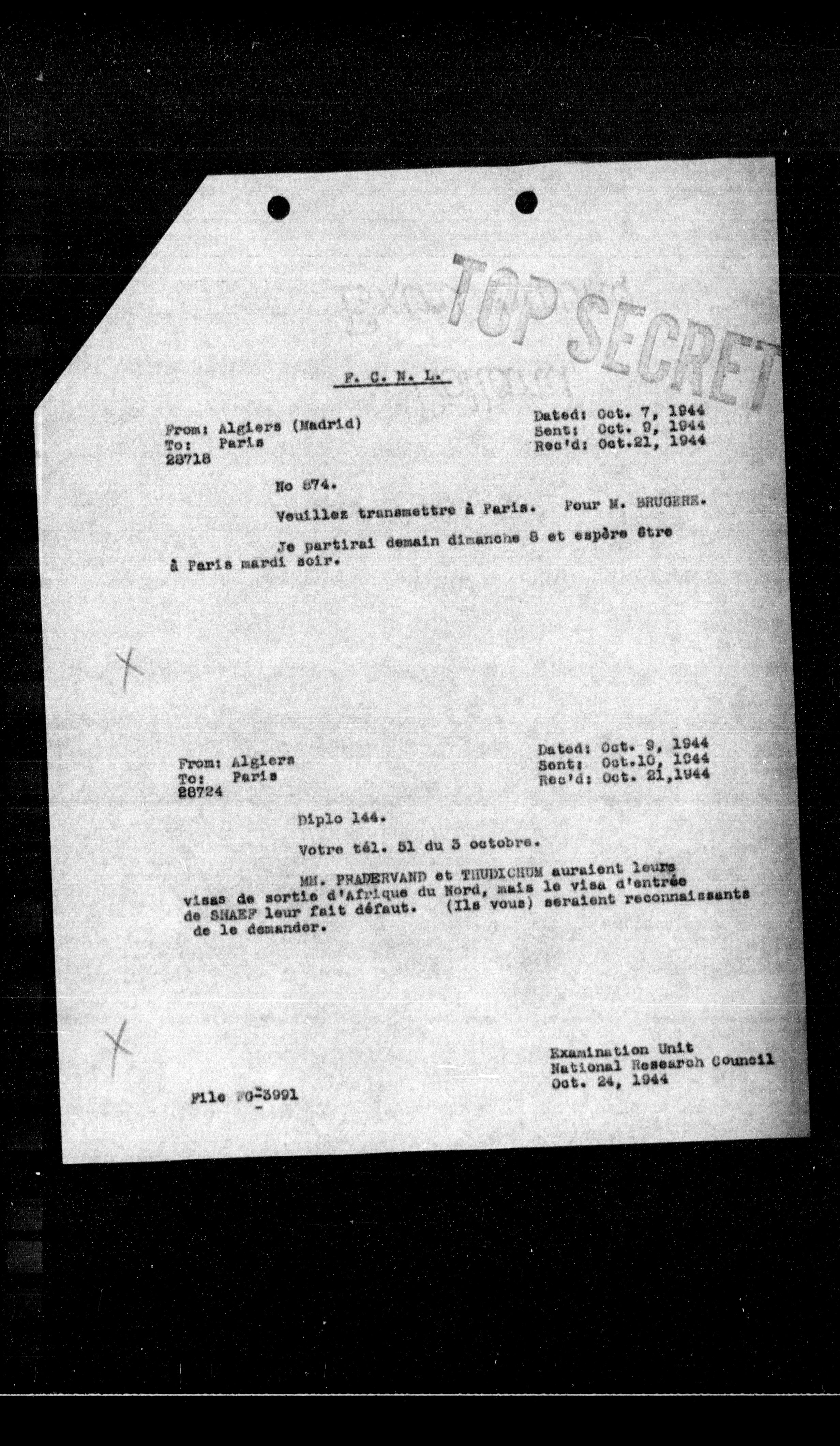 **MR. FRANCINO** et **TRUDICION** auraient leurs visas de sortie d'Afrique du Nord, mais le visa d'entrée de **SNARF** leur fait défaut. (Ils vous) seraient reconnaissants de le demander.