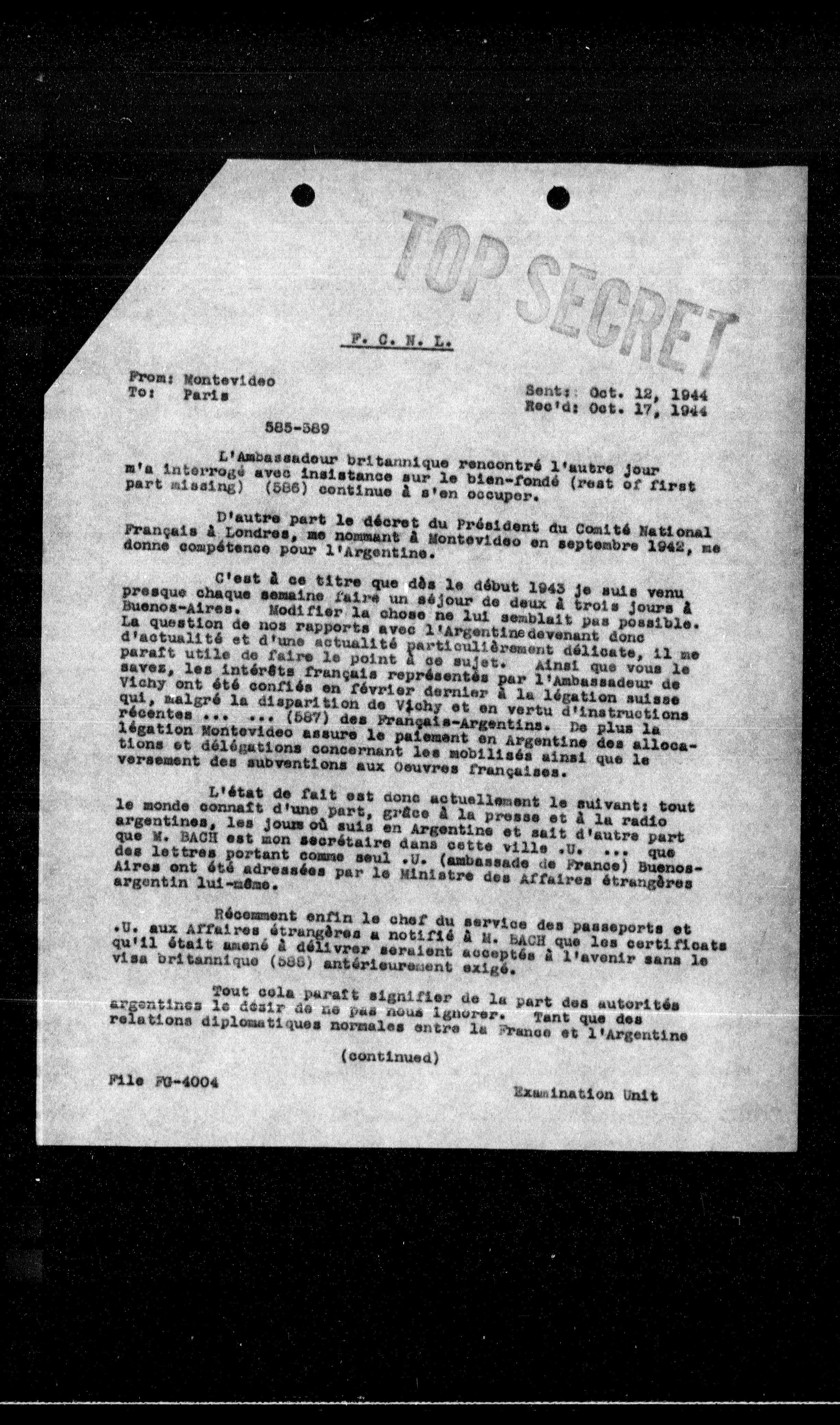 Français à Londres, me nommant à Montevideo en septembre 1942, me