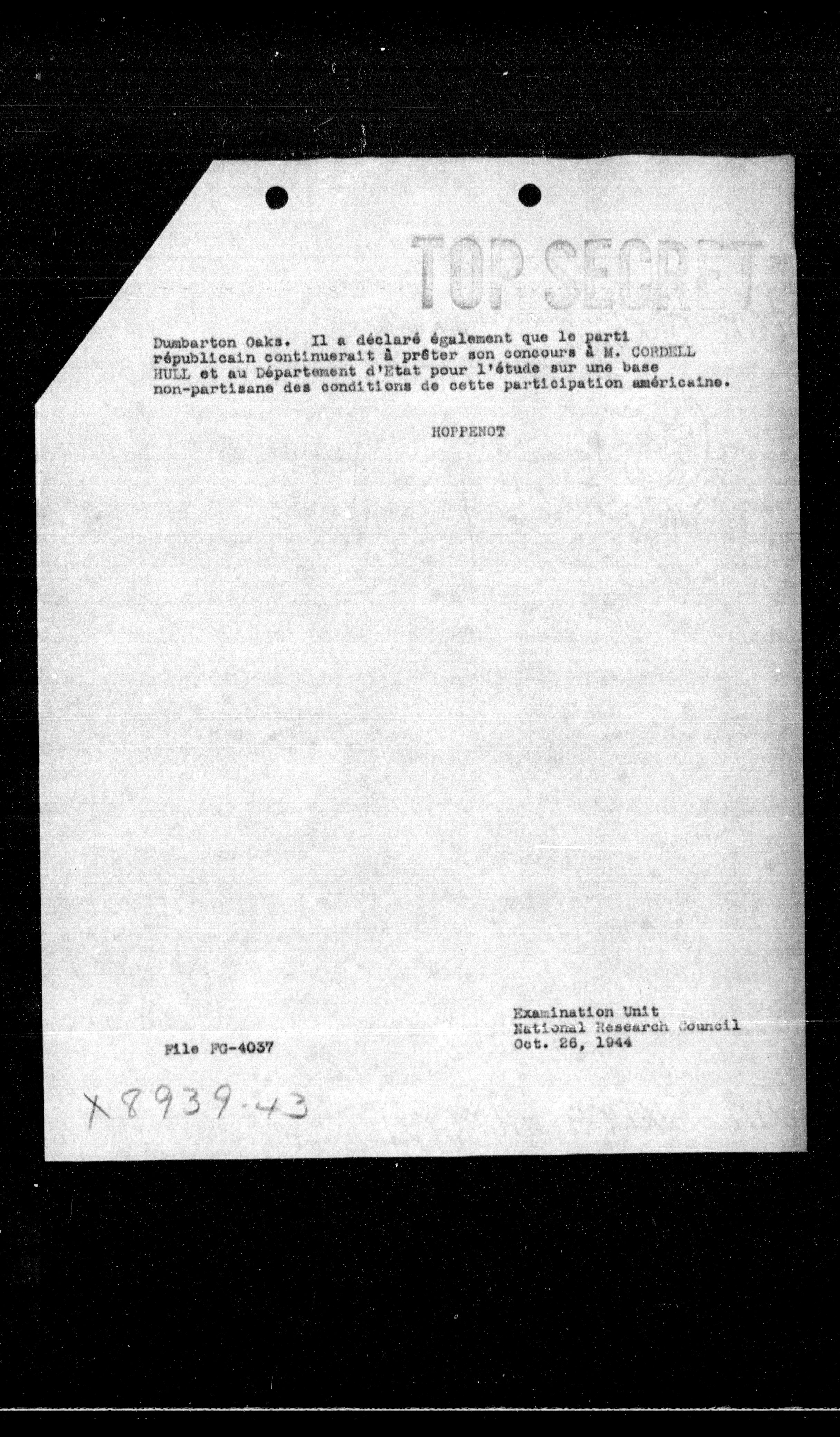 - Dumbarton Oaks. Il a déclaré également que le parti républicain continuerait à prêter son concours à M. CORDELL HULL et au Département d'Etat pour l'étude sur une base non-partisane des conditions de cette participation américaine.