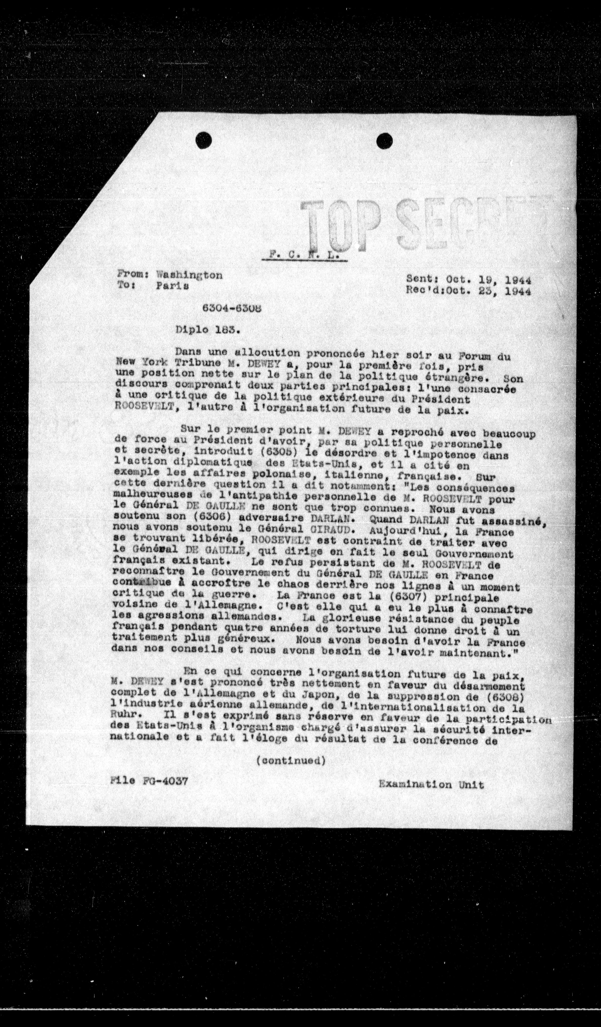 Sur le premier point M. DEWEY a reproché avec beaucoup de force au Président d'avoir, par sa politique personnelle et secrète, introduit (6308) le désordre et l'impotence dans l'action diplomatique des Etats-Unis, et il a cité en exemple les affaires polonaise, italienne, française. Sur cette dernière question il a dit notamment: "Les conséquences malheureuses de l'antipathie personnelle de M. ROOSEVELT pour le Général DE GAULLE ne sont que trop connues. Nous avons soutenu son (6306) adversaire DARLAN. Quand DARLAN fut assassiné, nous avons soutenu le Général GIRAUD. Aujourd'hui, la France se trouvant libérée, ROOSEVELT est contraint de traiter avec le Général DE GAULLE, qui dirige en fait le seul Gouvernement français existant. Le refus persistant de M. ROOSEVELT de reconnaître le Gouvernement du Général DE GAULLE en France contribue à accroître le chaos derrière nos lignes à un moment critique de la guerre. La France est la (6307) principale voisine de l'Allemagne. C'est elle qui a eu le plus à connaître les agressions allemandes. La glorieuse résistance du peuple français pendant quatre années de torture lui donne droit à un traitement plus généreux. Nous avons besoin d'avoir la France dans nos conseils et nous avons besoin de l'avoir maintenant."