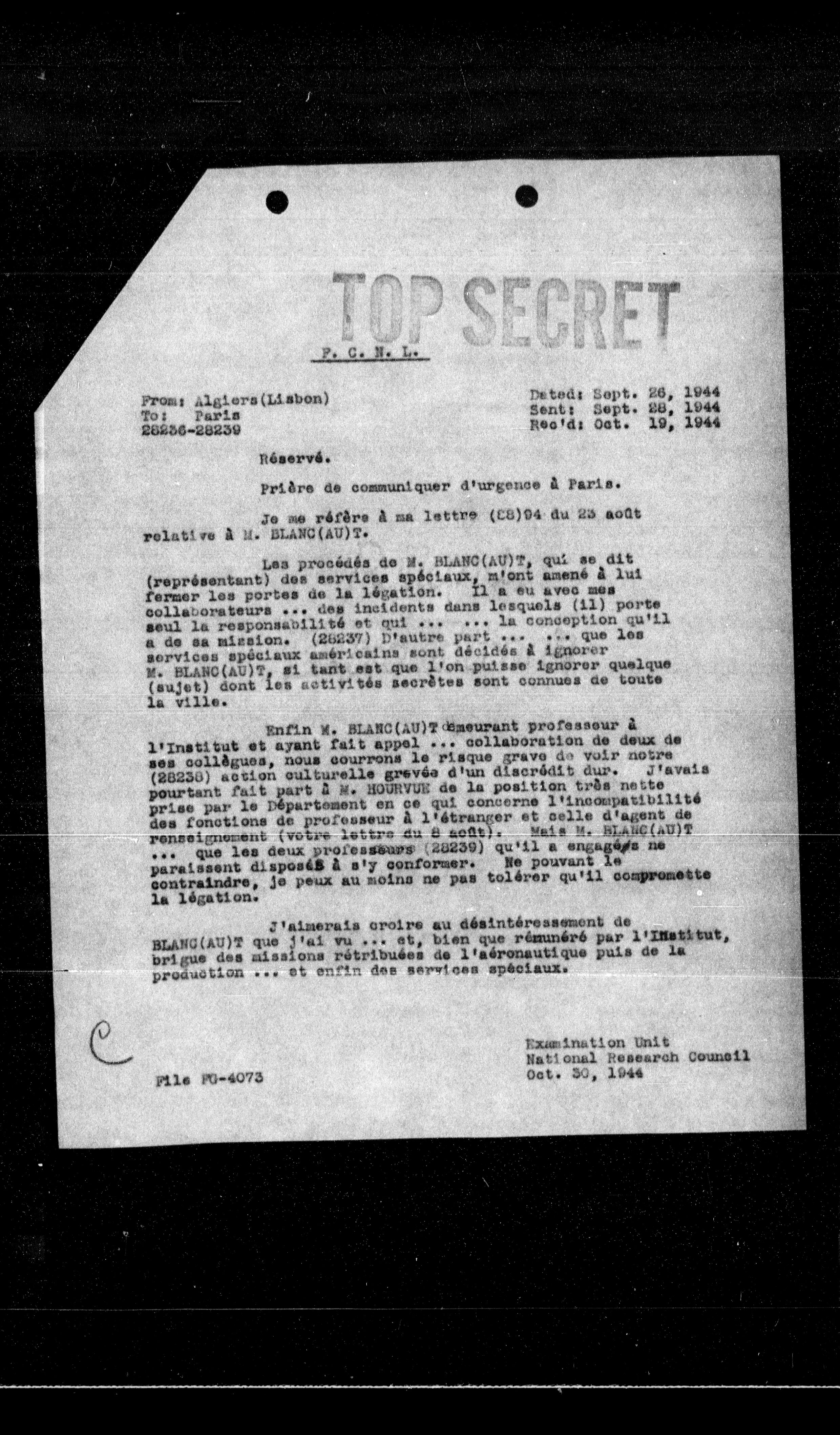 Les procédés de M. BLANC(AU)T, qui se dit (représentant) des services spéciaux, m'ont amené à lui fermer les portes de la légation. Il a eu avec mes collaborateurs des incidents dans lesquels (il) porte seul la responsabilité et qui la conception qu'il a de sa mission. (28237) D'autre part que les services spéciaux américains sont décidés à ignorer M. BLANC(AU)T, et tant est que l'on puisse ignorer quelque (sujet) dont les activités secrètes sont connues de toute la ville.