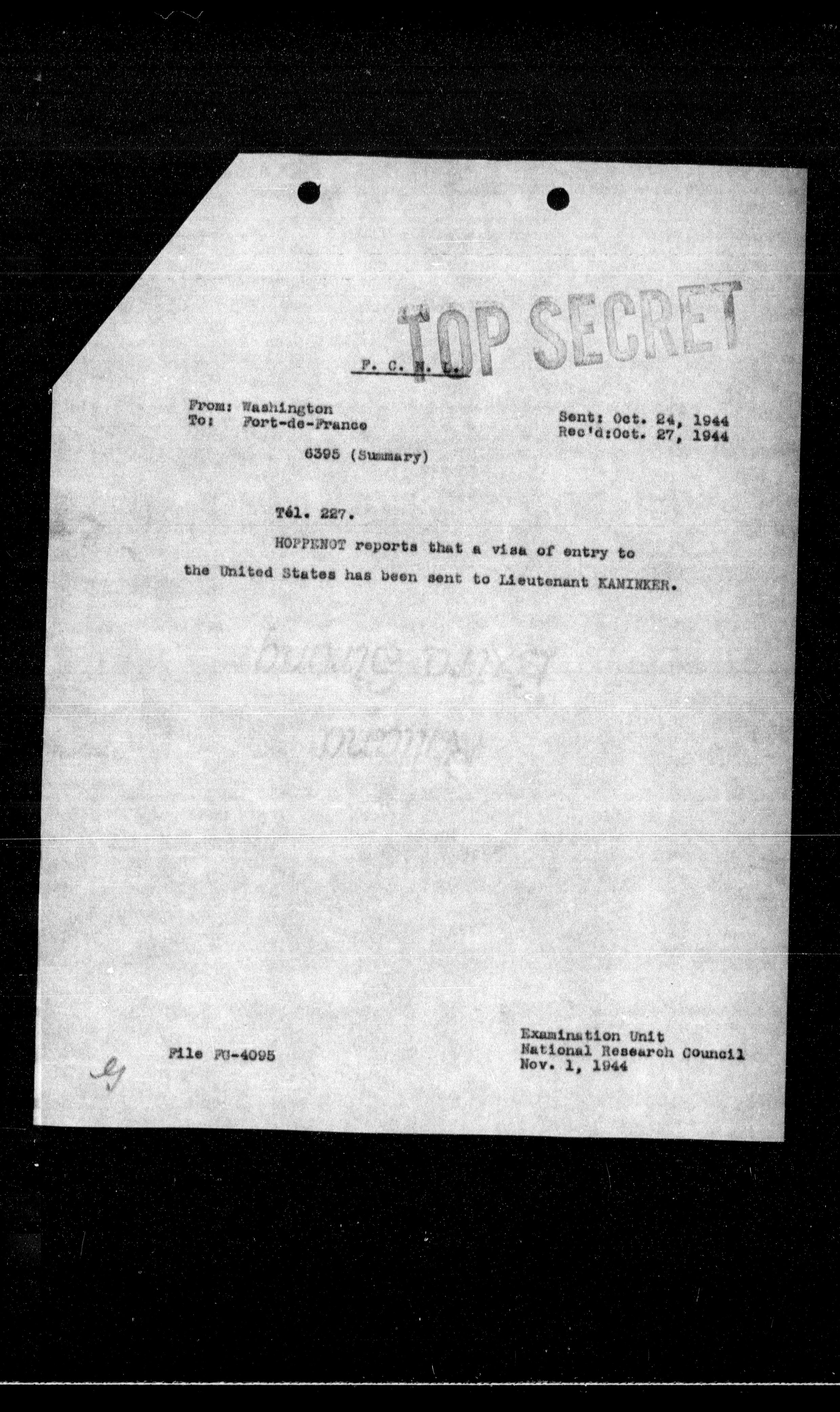 HOPPENOT reports that a visa of entry to the United States has been sent to Lieutenant KAMINKER.