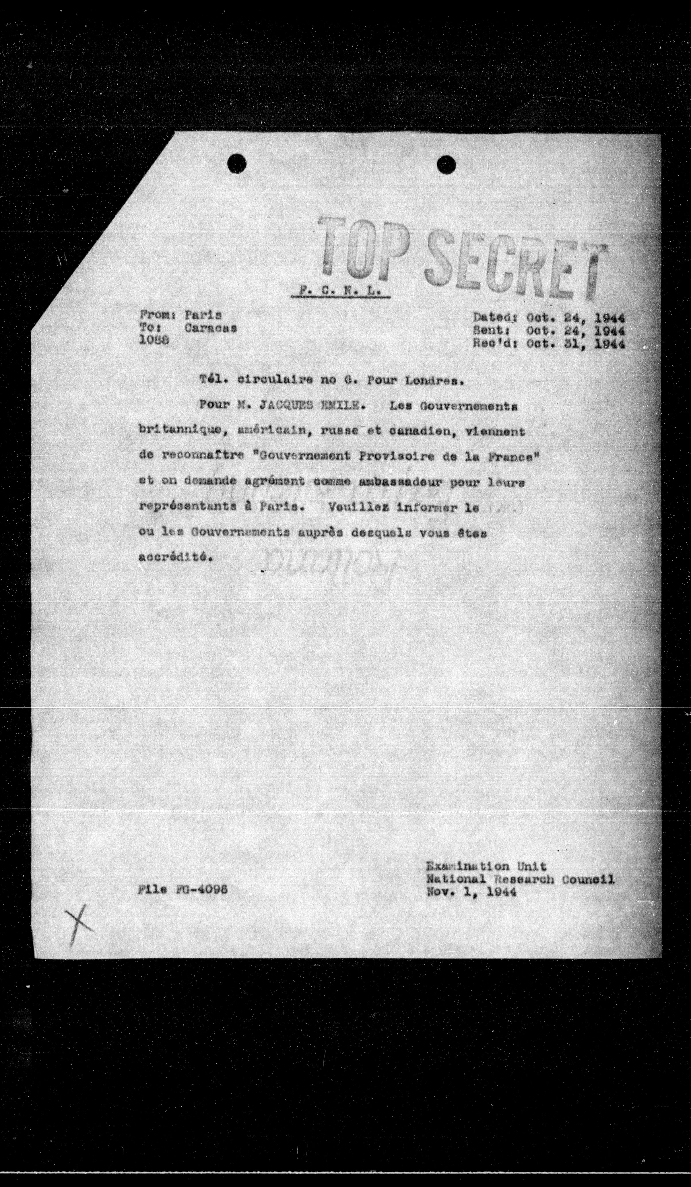 **Pour M. JACQUES ENILE. Les Gouvernements britannique, américain, russe et canadien, viennent de reconnaître "Gouvernement provisoire de la France" et on demande agrément comme ambassadeur pour leurs représentants à Paris. Veuillez informer le ou les Gouvernements auprès desquels vous êtes accrédité.**