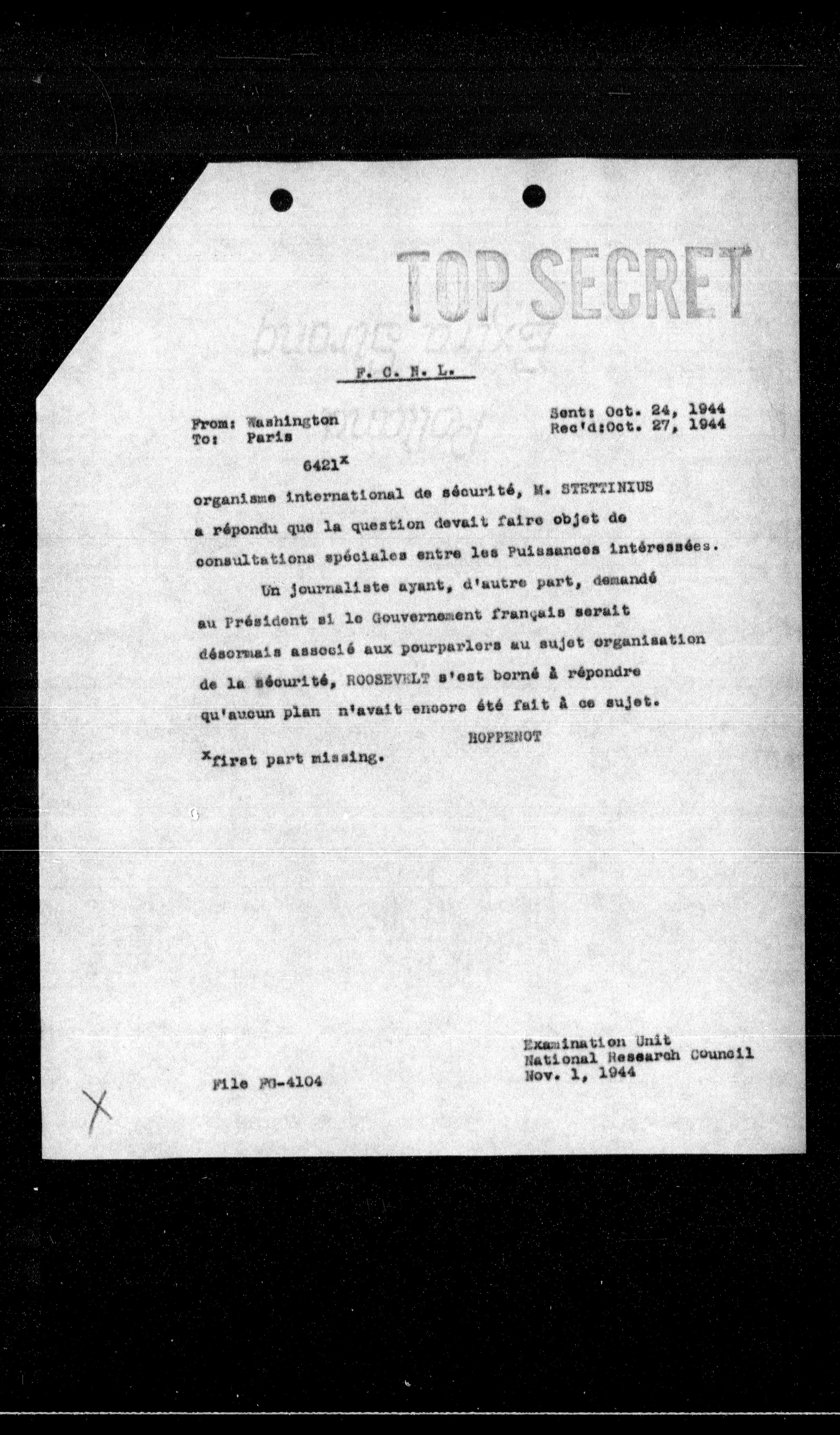Un journaliste ayant, d'autre part, demandé au Président si le Gouvernement français serait désormais associé aux pourparlers au sujet organisation de la sécurité, ROOSEVELT s'est borné à répondre qu'aucun plan n'avait encore été fait à ce sujet.