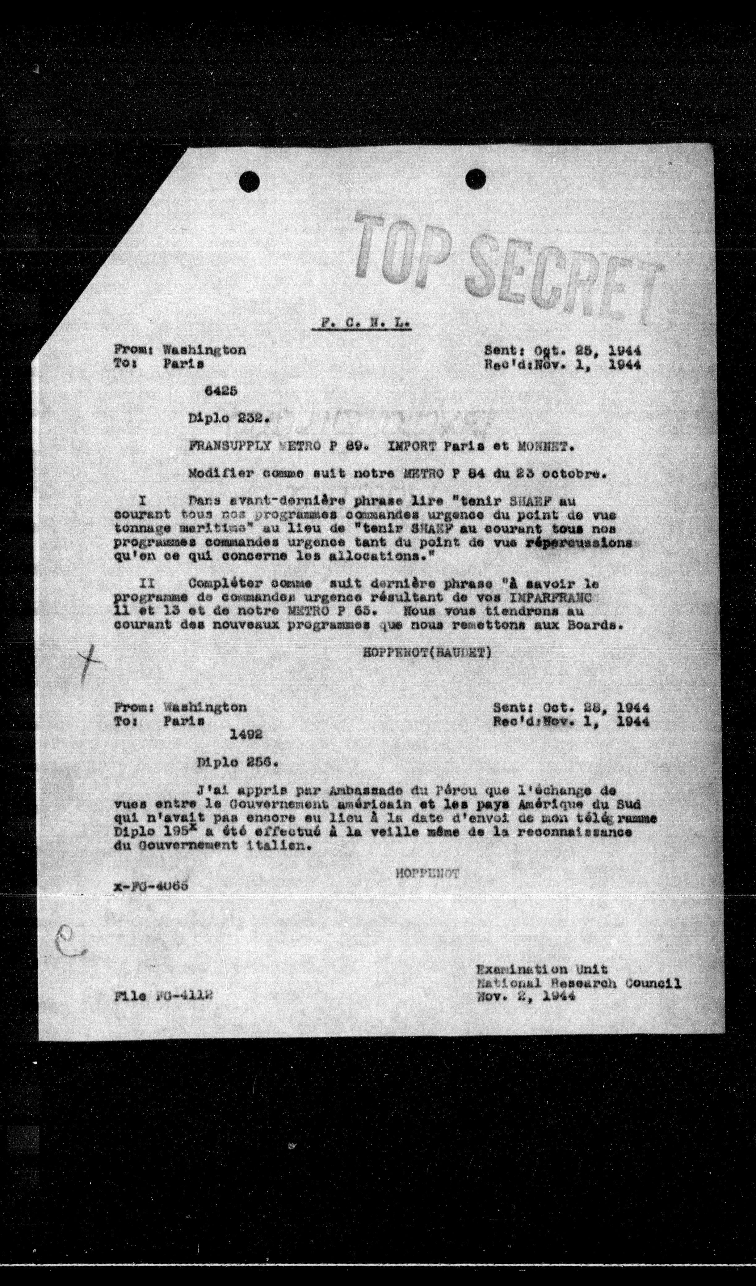 I Dans avant-dernière phrase lire "tenir SHAEF au courant tous nos programmes commandes urgence du point de vue tonnage maritime" au lieu de "tenir SHAEF au courant tous nos programmes commandes urgence tant du point de vue répercussions qu'en ce qui concerne les allocations."
