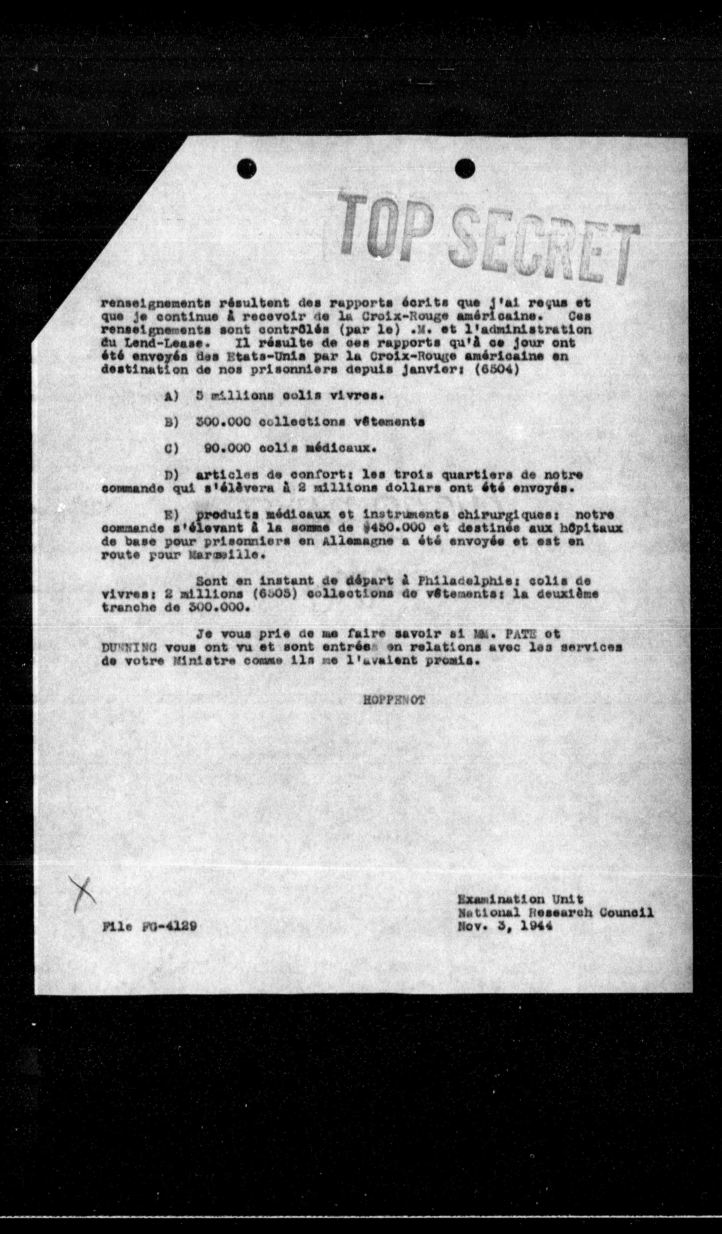 renseignements résultant des rapports écrits que j'ai reçus et que je continue à recevoir de la Croix-Rouge américaine. Ces renseignements sont contrôlés (par le) M. et l'administration du Lend-Lease. Il résulte de ces rapports qu'à ce jour ont été envoyés des États-Unis par la Croix-Rouge américaine en destination de nos prisonniers depuis janvier (6504).