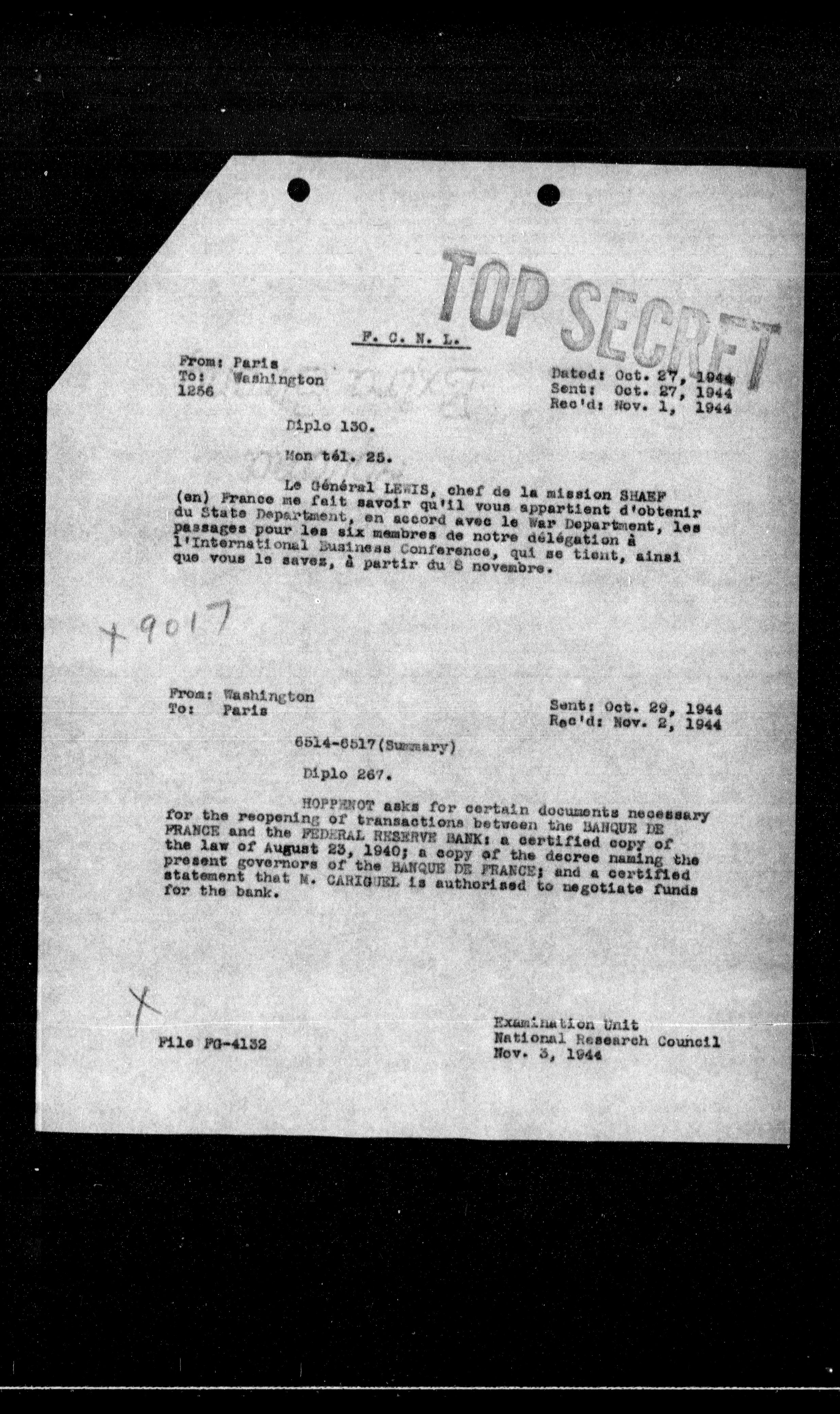 Le Général LEWIS, chef de la mission SHAEF (en) France me fait savoir qu'il vous appartient d'obtenir du State Department, en accord avec le War Department, les passages pour les six membres de notre délégation a l'International Business Conference, qui se tient, ainsi que vous le savez, a partir du 5 novembre.