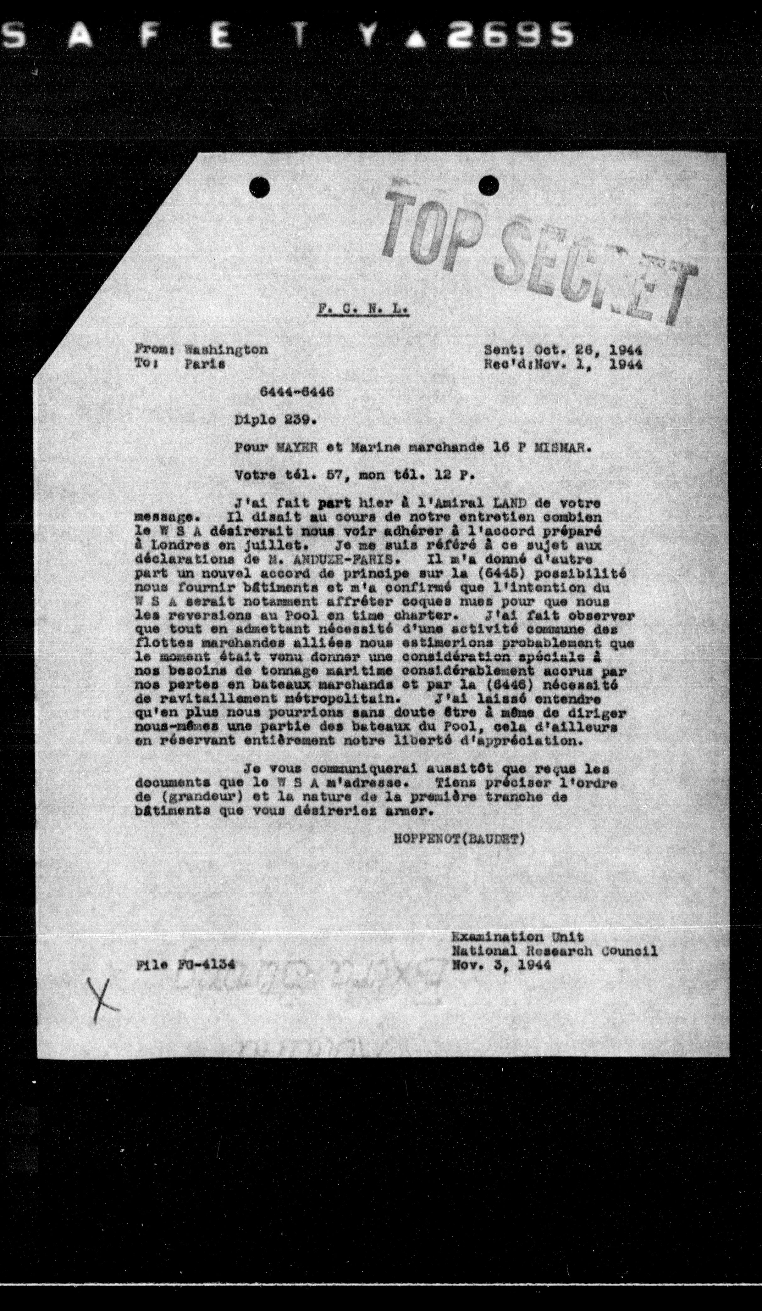 J'ai fait part hier a l'amiral LARD de votre message. Il disait au cours de notre entretien combien le W S a désirerait nous voir adhérer a l'accord préparé a Londres en juillet. Je me suis référé a ce sujet aux déclarations de M. ANDUZE-FARIS. Il m'a donné d'autre part un nouvel accord de principe sur la (6445) possibilité nous fournir bâtiments et m'a confirmé que l'intention du W S a serait notamment affréter coques nues pour que nous les reversions au Pool en time charter. J'ai fait observer que tout en admettant nécessité d'une activité commune des flottes marchandes alliées nous estimerions probablement que le moment était venu donner une considération spéciale a nos besoins de tonnage maritime considerablement accrus par nos pertes en bateaux marchands et par la (6446) nécessité de ravitaillement métropolitain. J'ai laissé entendre qu'en plus nous pourrions sans doute être a même de diriger nous-méres une partie des bateaux du Pool, cela d'ailleurs en réservant entièrement notre liberté d'appréciation.