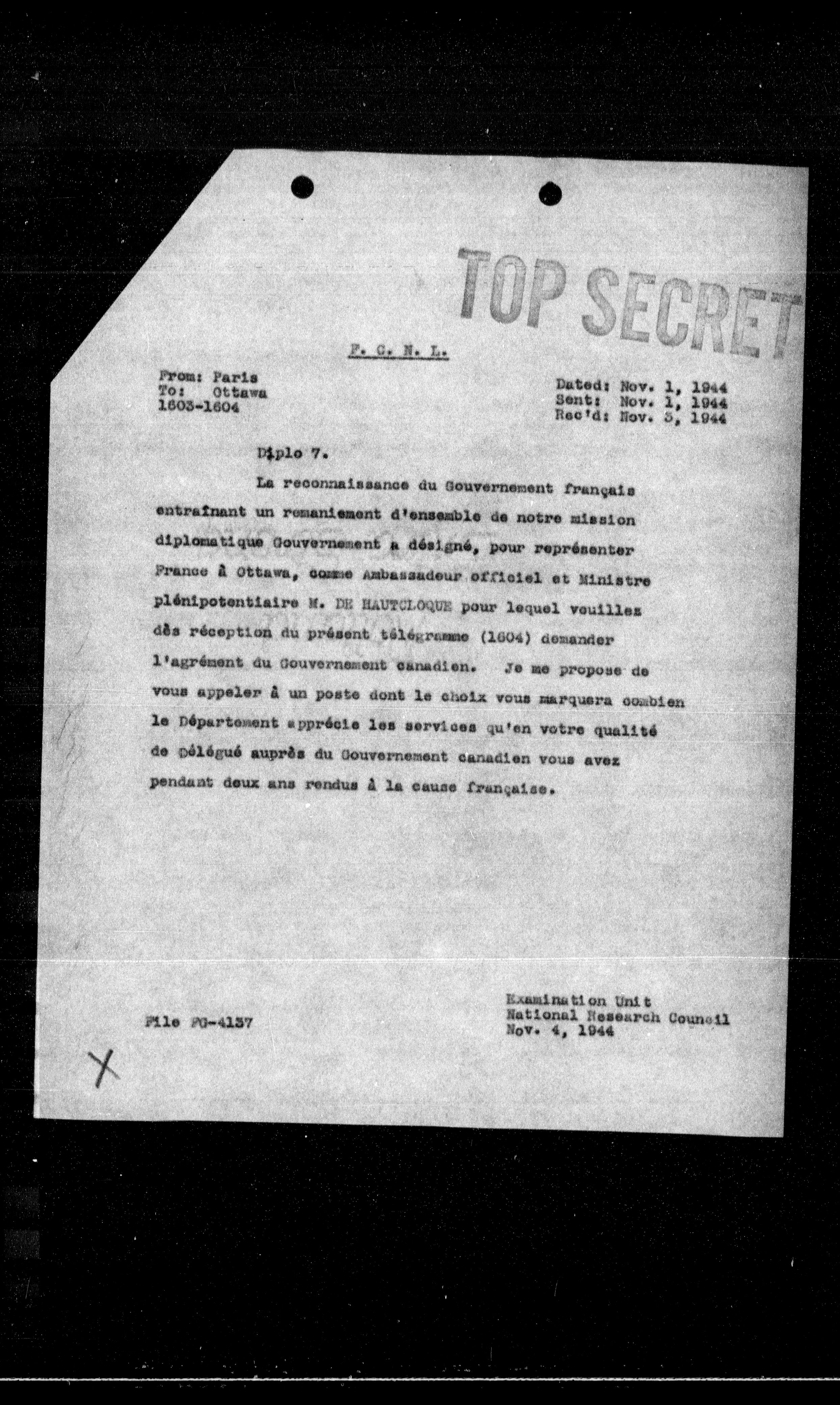La reconnaissance du Gouvernement français entraînant un remaniement d'ensemble de notre mission diplomatique Gouvernement a désigné, pour représenter France à Ottawa, comme Ambassadeur officiel et Ministre plénipotentiaire N. DE HAUTOLOGUE pour lequel veuillez dès réception du présent télégramme (1604) demander l'agrément du Gouvernement canadien. Je me propose de vous appeler à un poste dont le choix vous marquera combien le Département apprécie les services qu'en votre qualité de délégué auprès du Gouvernement canadien vous avez pendant deux ans rendus à la cause française.