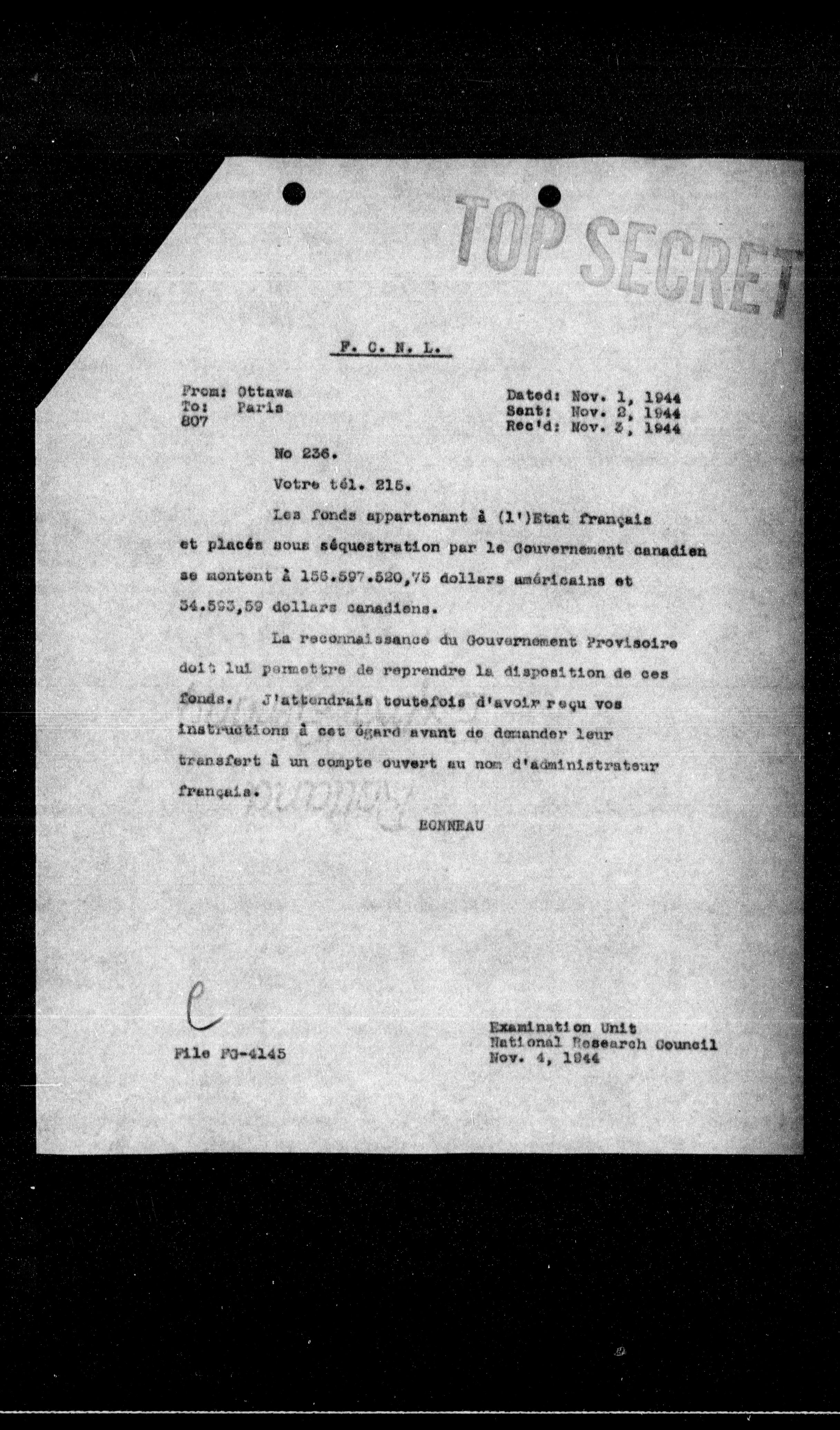 Les fonds appartenant à (1) Etat français et placés sous séquestration par le Gouvernement canadien se montent à 150.597.520,75 dollars américains et 34.593,59 dollars canadiens.
