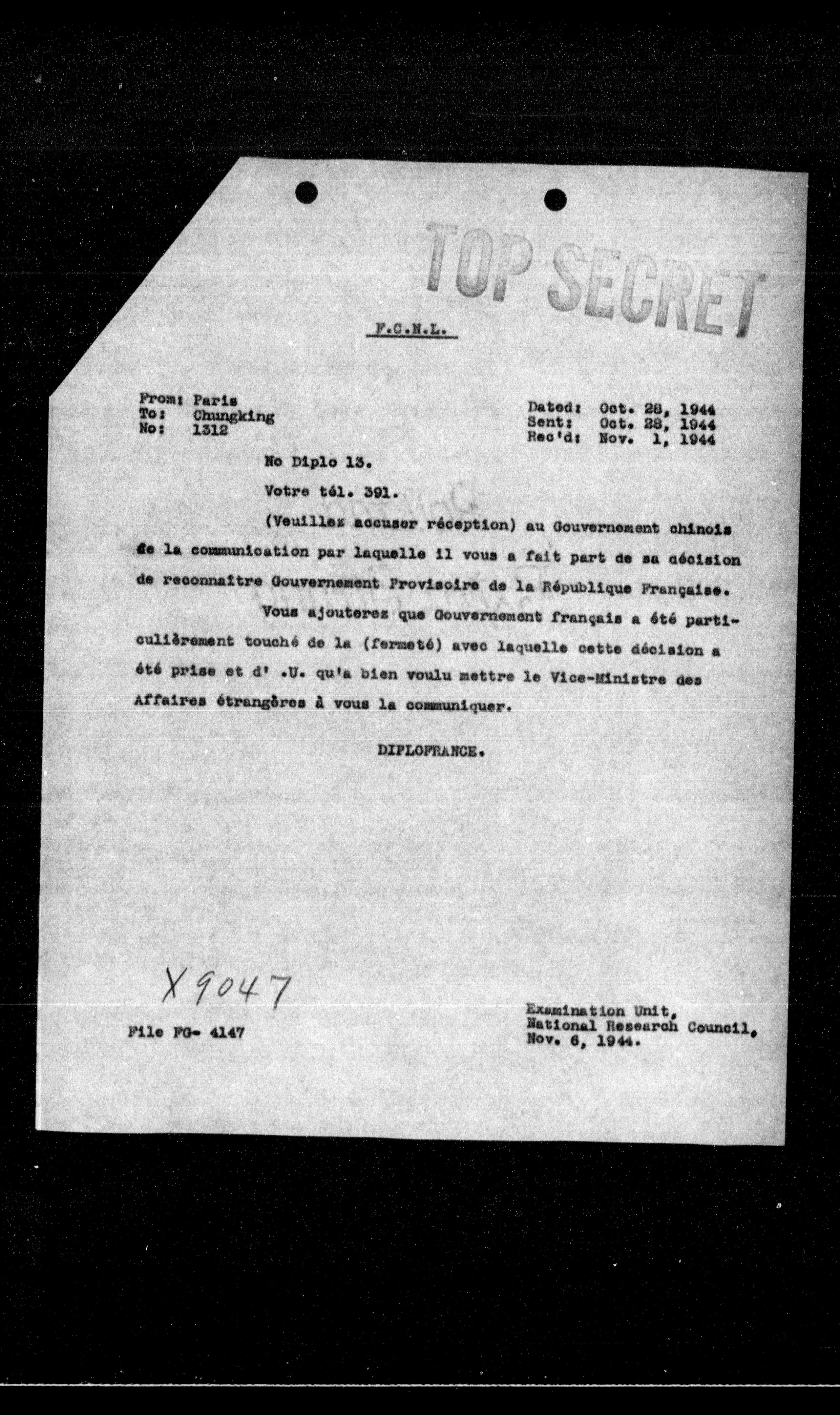 **From:** Paris **To:** Chungking **No:** 1312 **Dated:** Oct. 28, 1944 **Sent:** Oct. 28, 1944 **Rec'd:** Nov. 1, 1944