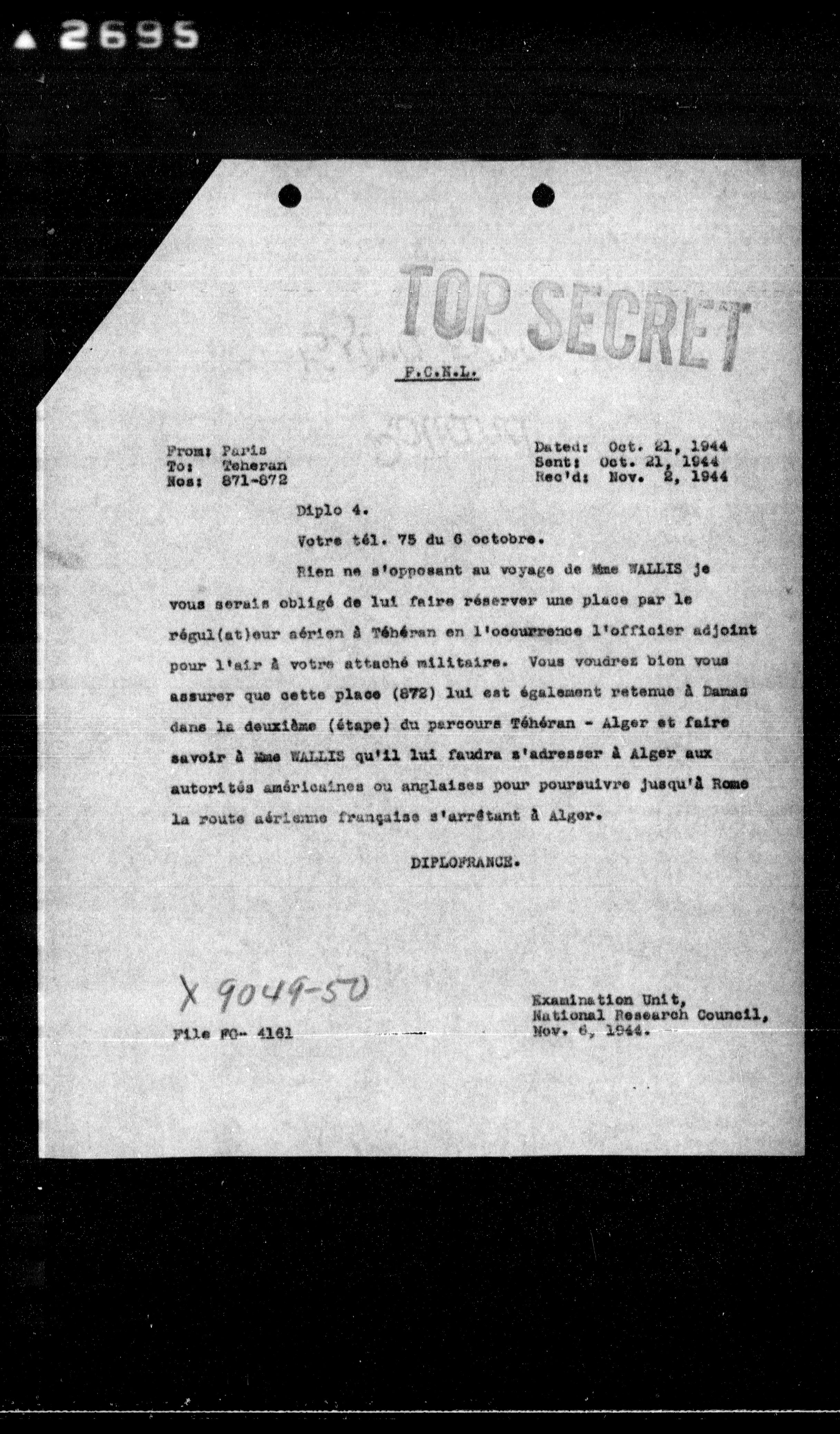 Bien ne s'opposant au voyage de Mme WALLIS je vous serais obligé de lui faire réserver une place par le régul(at)eur aérien à Téhéran en l'occurrence l'officier adjoint pour l'air à votre attaché militaire. Vous voudrez bien vous assurer que cette place (872) lui est également retenue à Damas dans la deuxième (étape) du parcours Téhéran - Alger et faire savoir à Mme WALLIS qu'il lui faudra s'adresser à Alger aux autorités américaines ou anglaises pour poursuivre jusqu'à Rome la route aérienne française s'arrêtant à Alger.