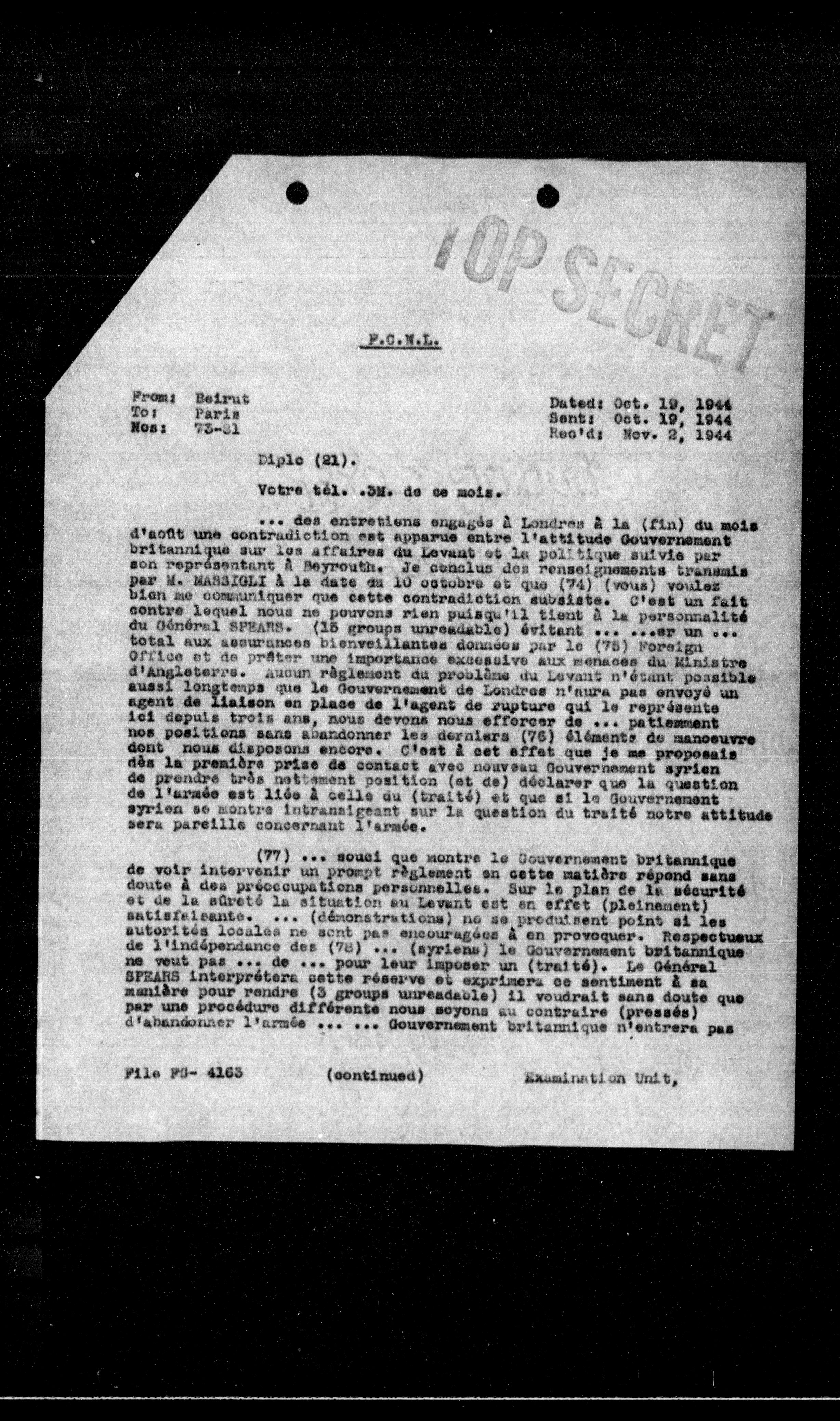 ... des entretiens engagés a Londres a la (fin) du mois d'août une contradiction est apparue entre l'attitude Gouvernement britannique sur les affaires du Levant et la politique suivie par son représentant a Beyrouth. Je conclue des renseignements transmis par M. HARRIGLI a la date du 10 octobre et que (74) (vous) voulez bien me communiquer que cette contradiction subsiste. c'est un fait contre lequel nous ne pouvons rien puisqu'il tient a la personnalité du Général BFRANS. (15 groups unreadable) évitant ... ...er un ... total aux assurances bienveillantes donnees par le (75) Foreign Office et de prêter une importance excessive aux menaces du Ministre d'Angleterre. Auoun reglement du problème du Levant n'étant possible aussi longtemps que le Gouvernement de Londres n'aura pas envoyé un agent de liaison en place de l'agent de rupture qui le représente ici depuis trois ans, nous devons nous efforcer de ... patiemment nos positions sans abandonner les derniers (76) éléments de manoeuvre dont nous disposons encore. C'est a cet effet que je me proposais dès la première prise de contact avec nouveau Gouvernement syrien de prendre très nettement position (et de) déclarer que la question de l'armée est liée a celle du (traité) et que si le Gouvernement syrien se montre intransigeant sur la question du traité notre attitude sera pareille concernant l'armée.