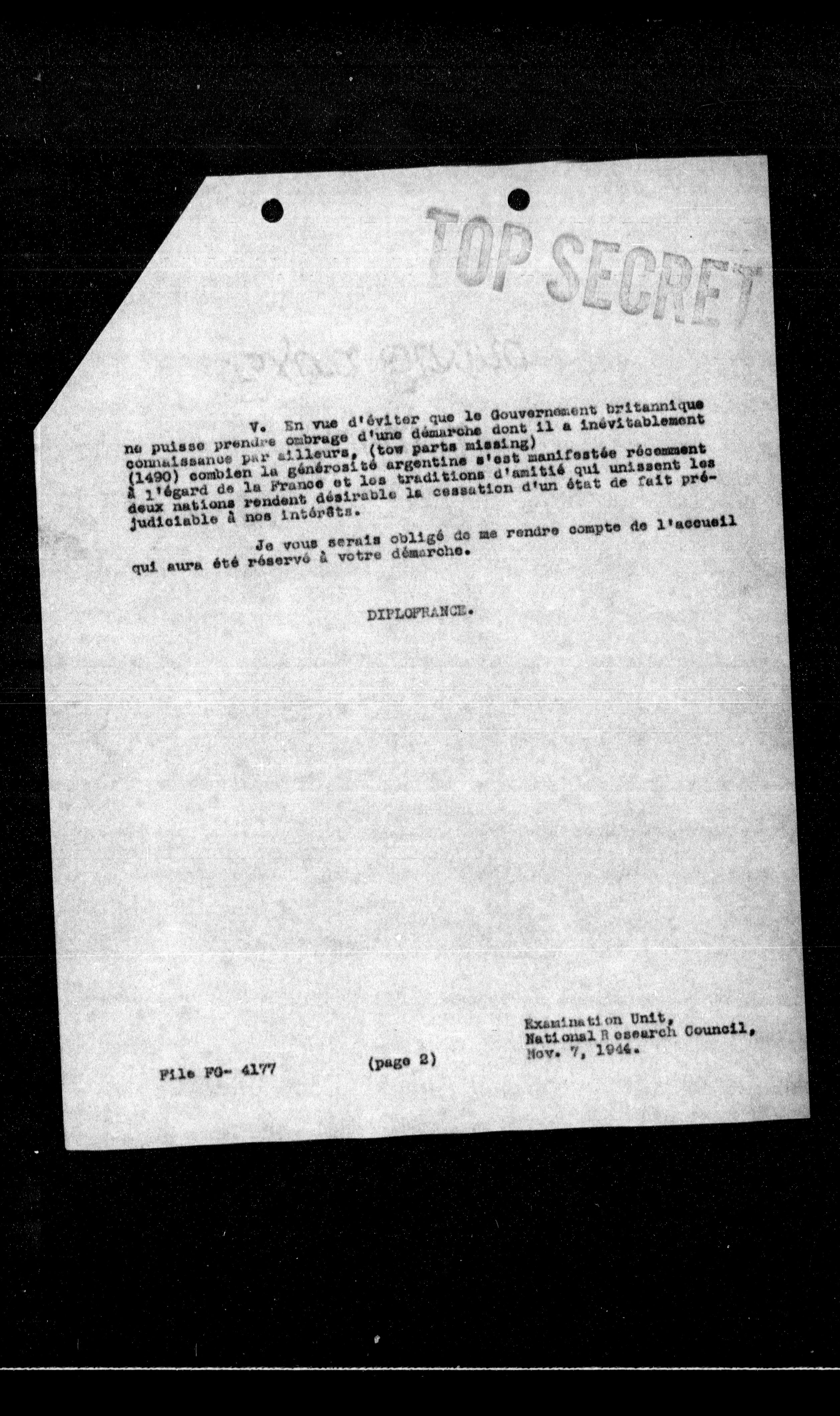 V. En vue d'éviter que le Gouvernement britannique ne puisse prenare cobrage d'une démarche dont il a inévitablement connaissance par ailleurs, (tou parts missing) (1490) combien la générosité argentine s'est manifestée récemment a l'égard de la France et les traditions d'amitié qui unissent les deux nations rendent désirable la cessation d'un état de fait préjudiciable à nos intérêts.