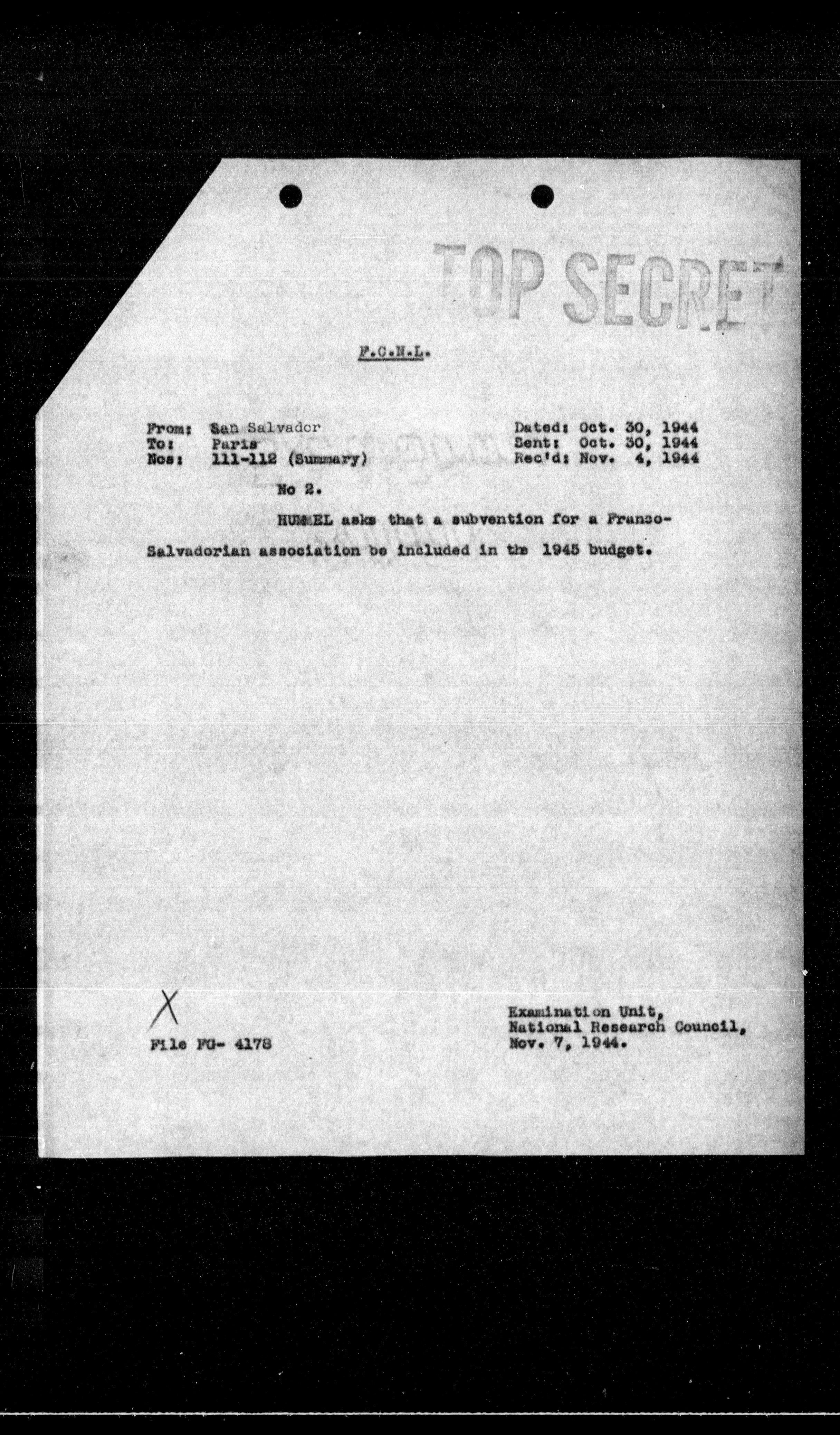 **To:** HUMMEL asks that a subvention for a Frango-Salvadorian association be included in the 1945 budget.